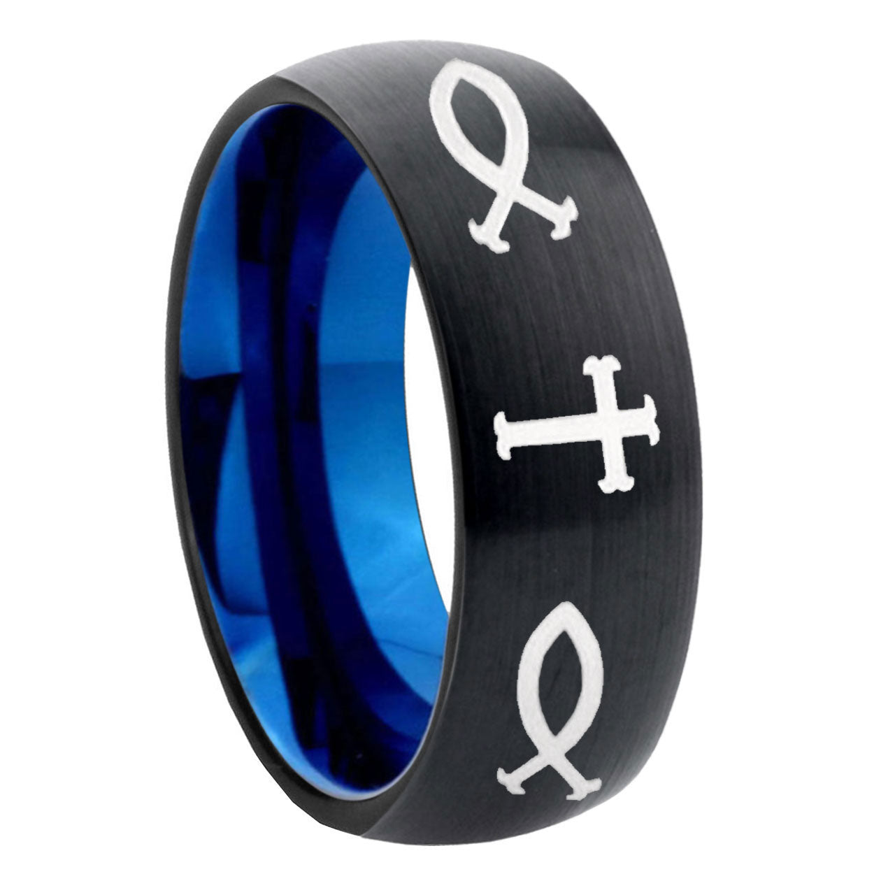 Intruding 5, 8mm Fish & Cross Dome Black And Blue Tungsten Carbide Mens Wedding Band . Offer in both 5mm and 8mm band width black and blue plated finished from size 4 to 14