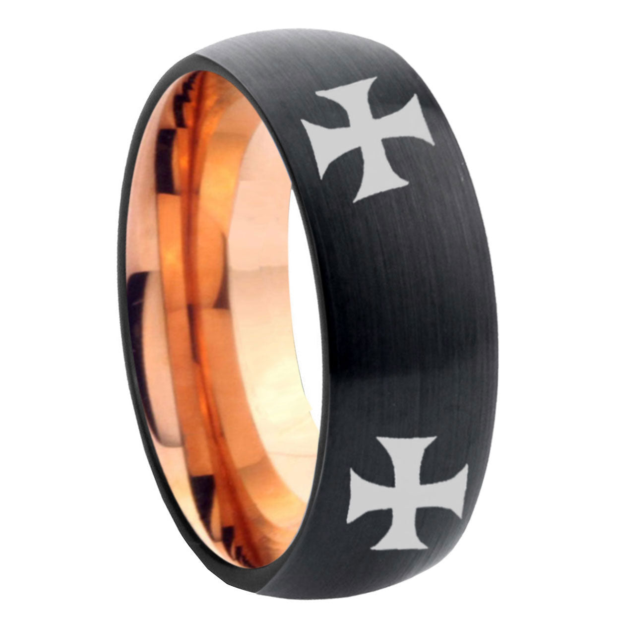 Intruding 5, 8mm 4 Maltese Cross Dome Black And Rose Gold Tungsten Carbide Mens Wedding Band . Offer in both 5mm and 8mm band width Black And Rose Gold plated finished from size 4 to 14