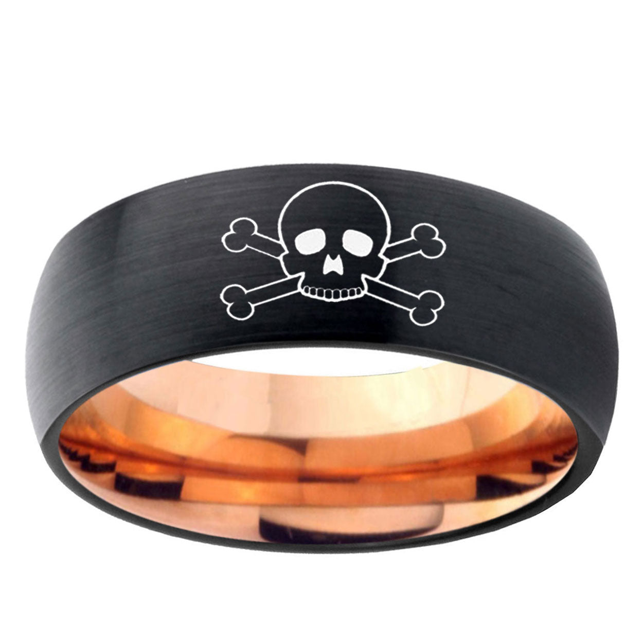 Intruding 5, 8mm Skull Dome Black And Rose Gold Tungsten Carbide Mens Anniversary Ring . Offer in both 5mm and 8mm band width Black And Rose Gold plated finished from size 4 to 14
