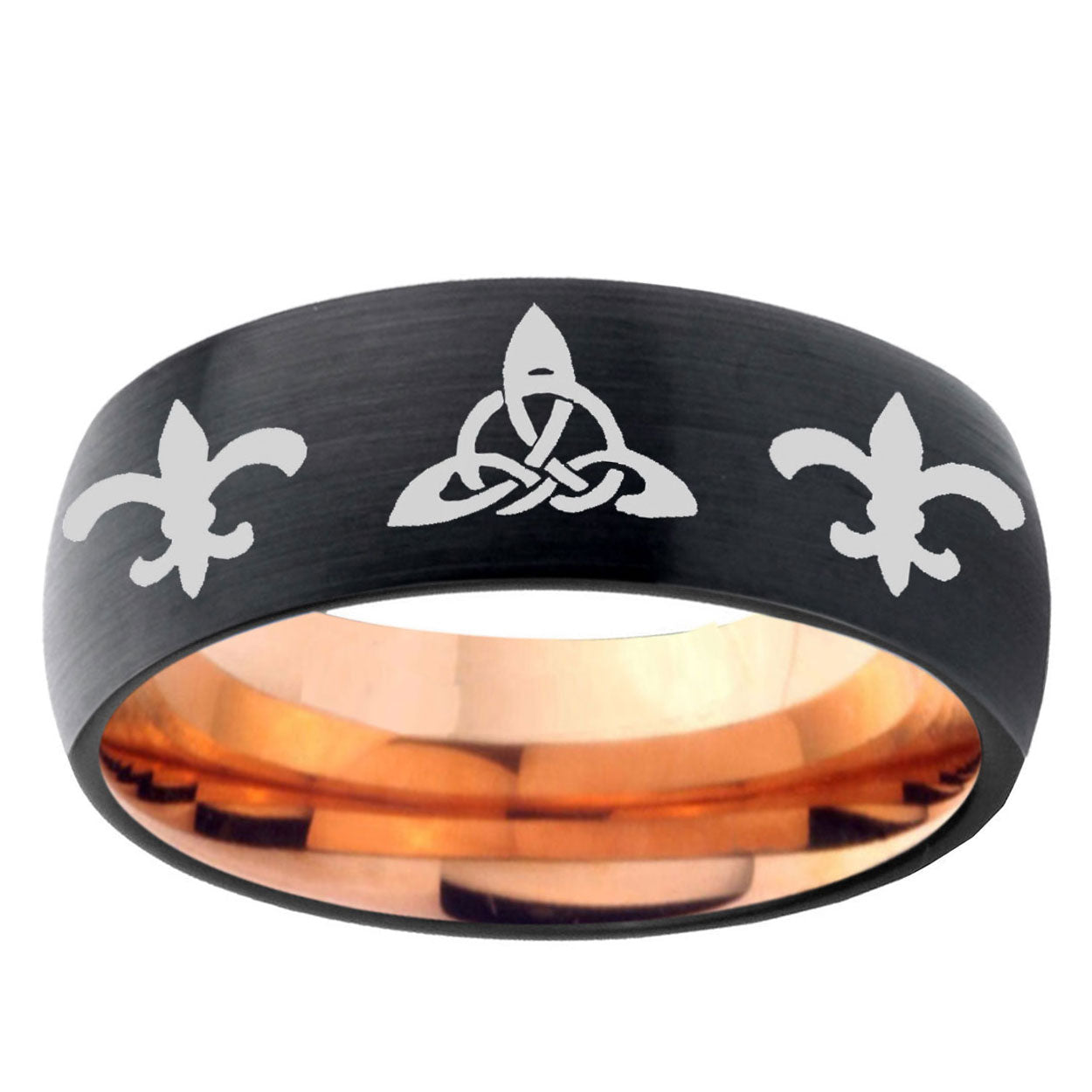 Intruding 5, 8mm Celtic Triangle Fleur-De-Lis Dome Black And Rose Gold Tungsten Carbide Men's Bands Ring . Offer in both 5mm and 8mm band width Black And Rose Gold plated finished from size 4 to 14