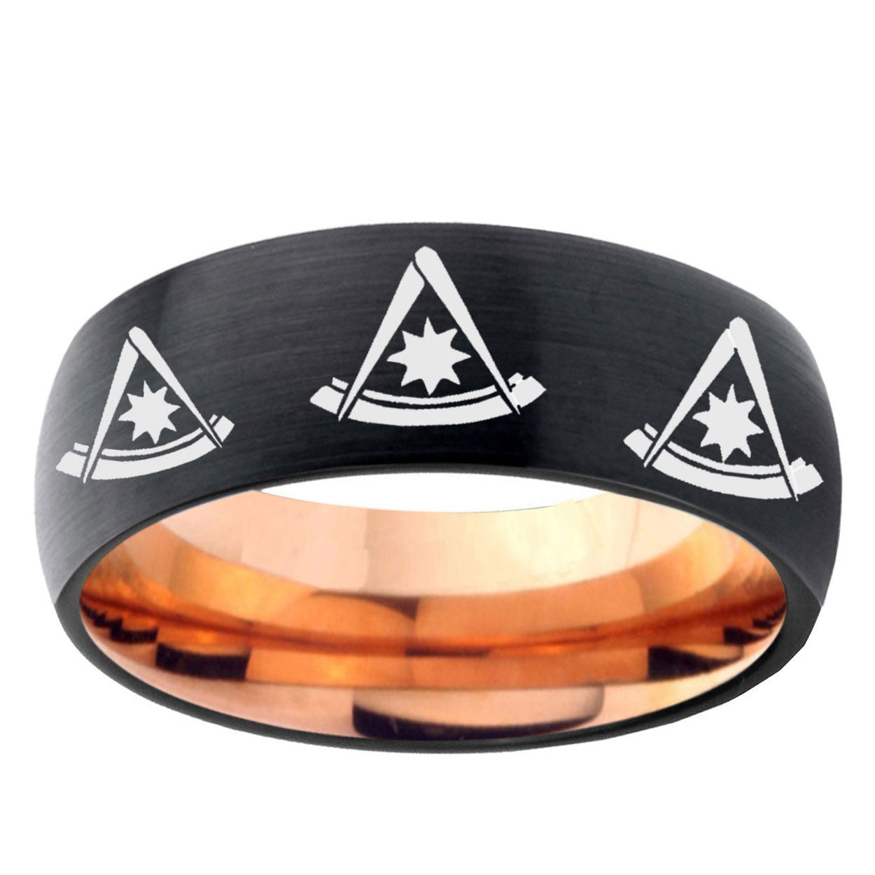 Intruding 5, 8mm Multiple Pester Master Masonic Dome Black And Rose Gold Tungsten Mens Promise Ring . Offer in both 5mm and 8mm band width Black And Rose Gold plated finished from size 4 to 14