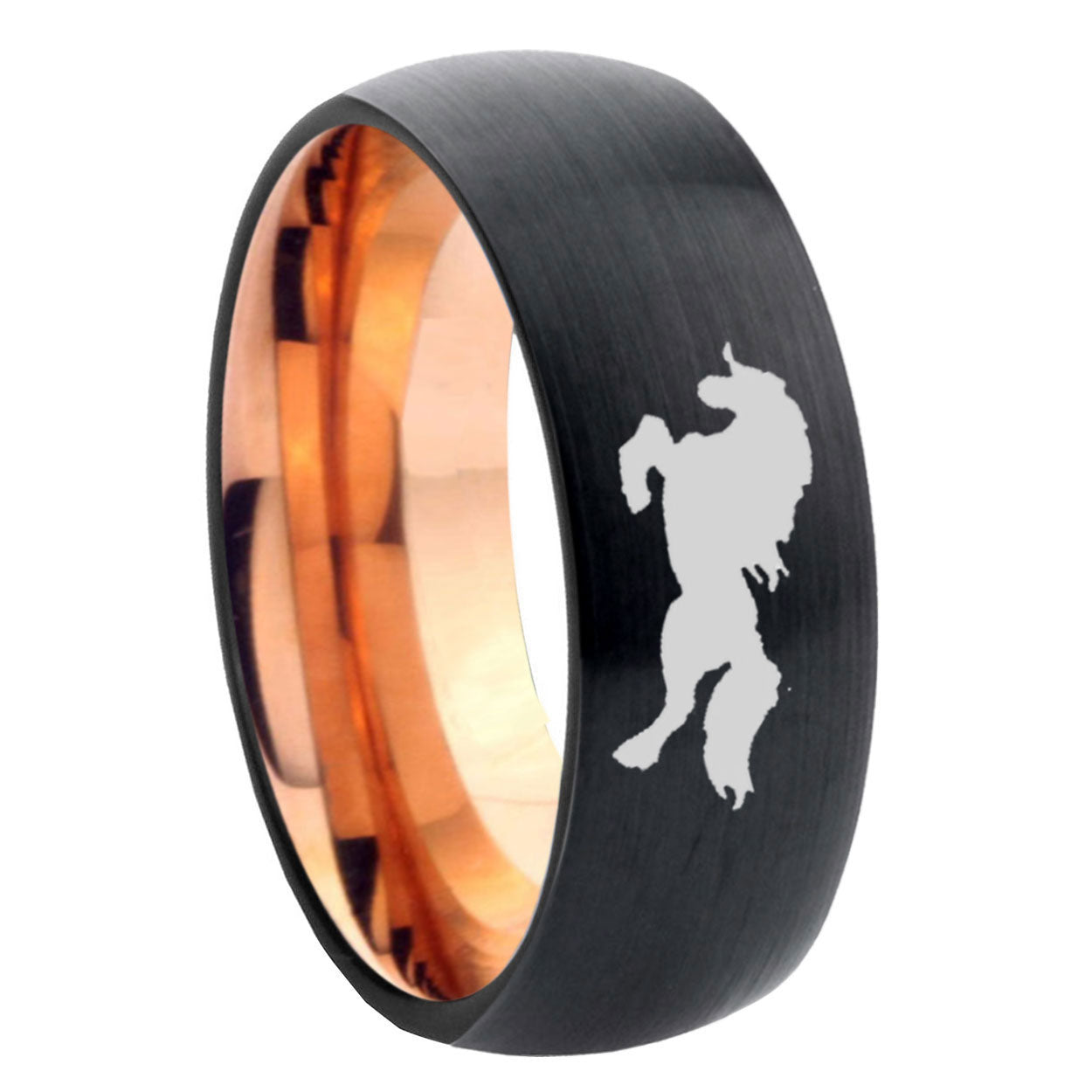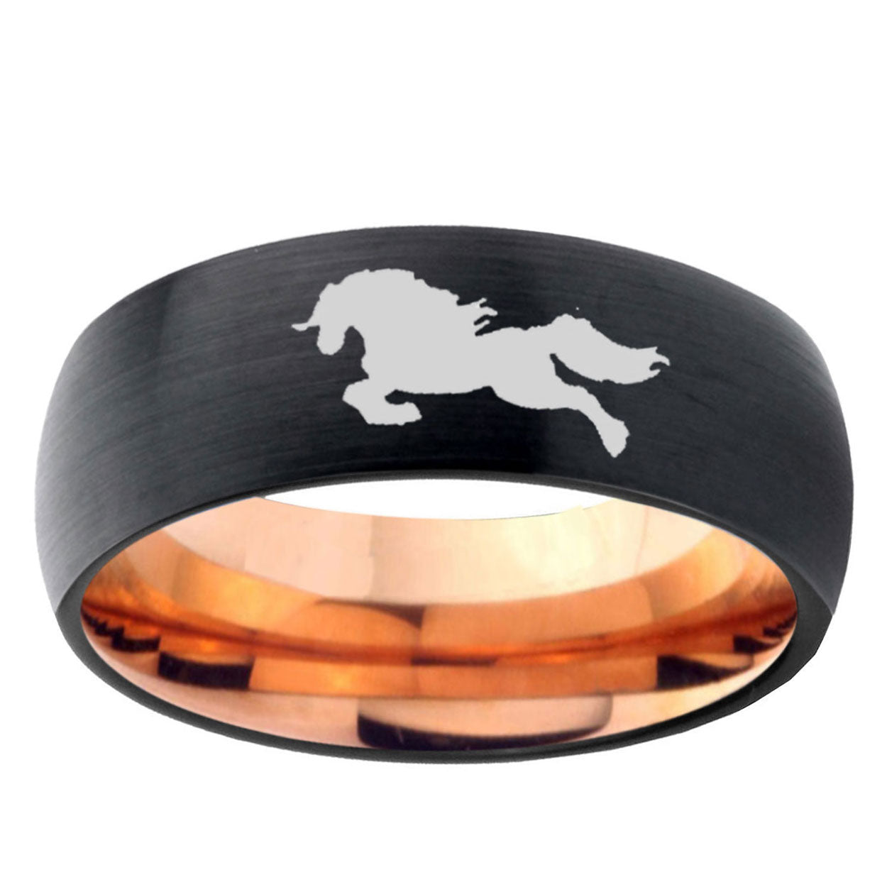 Intruding 5, 8mm Horse Dome Black And Rose Gold Tungsten Carbide Men's Engagement Band . Offer in both 5mm and 8mm band width Black And Rose Gold plated finished from size 4 to 14