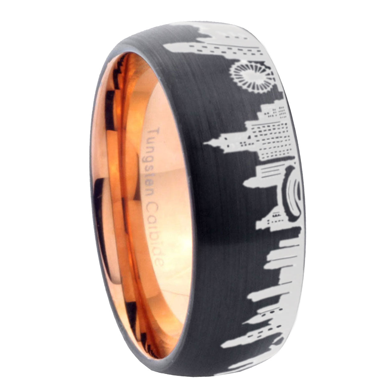 8mm Chicago City Dome Brushed Black Tungsten Rose Gold Inside Mens Wedding Band