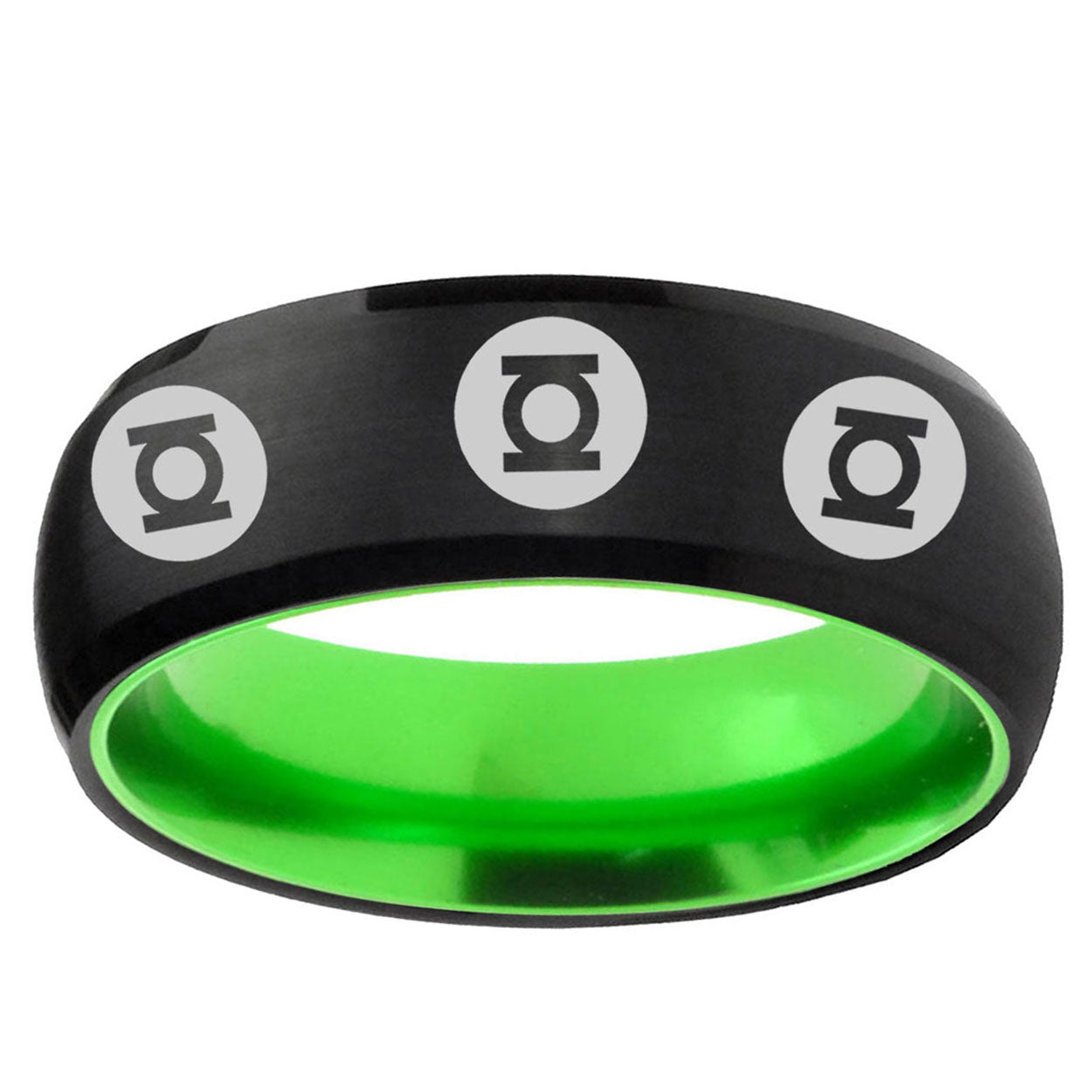 Intruding 8mm Multiple Green Lantern Dome Black And Green Unique Men Wedding Ring . Offer in men wedding band in 8mm band width brushed Black And Green plated finished from size 7 to 14