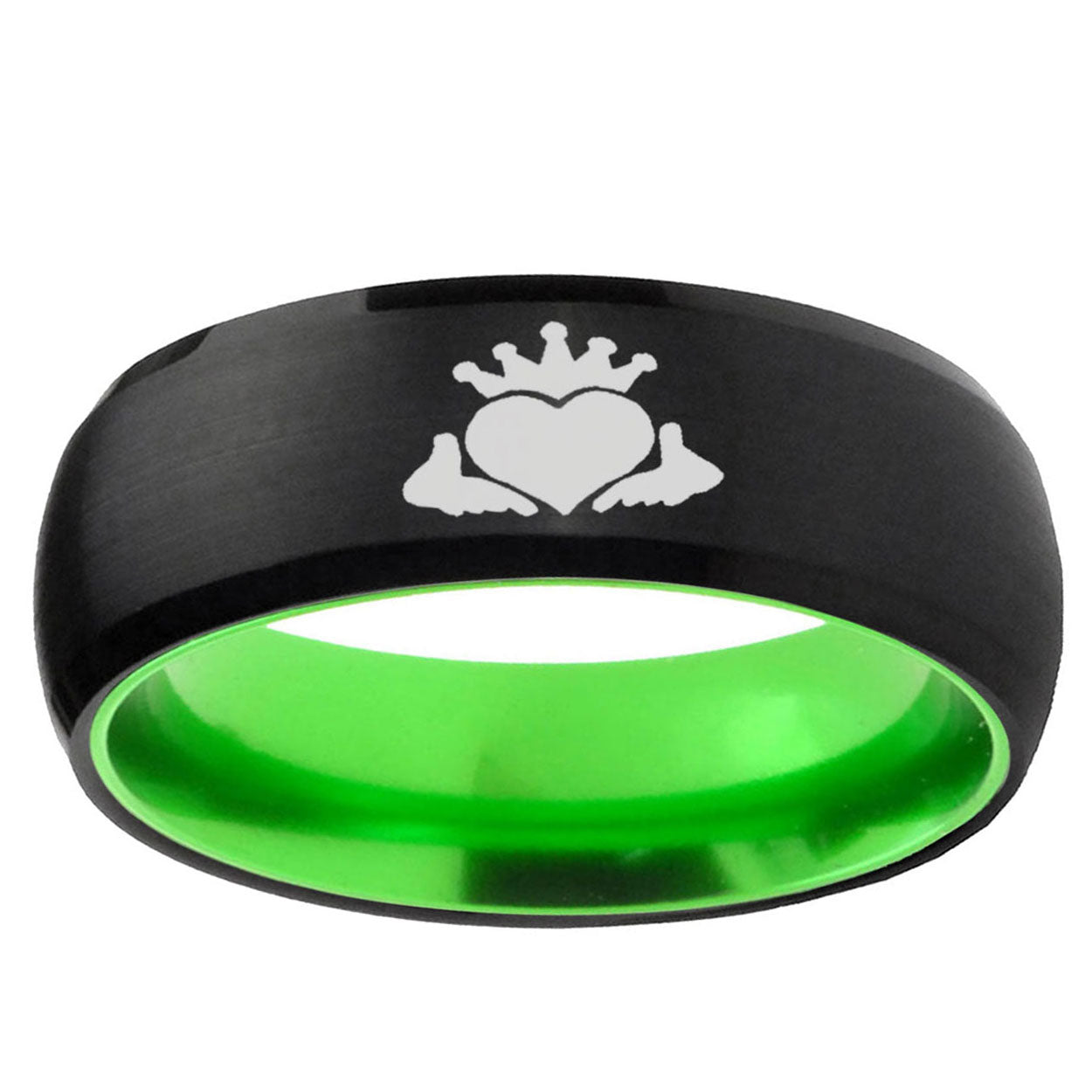 Intruding 8mm Claddagh Design Dome Black And Green Tungsten Carbide Anniversary Ring . Offer in men wedding band in 8mm band width Black And Green plated finished from size 7 to 14