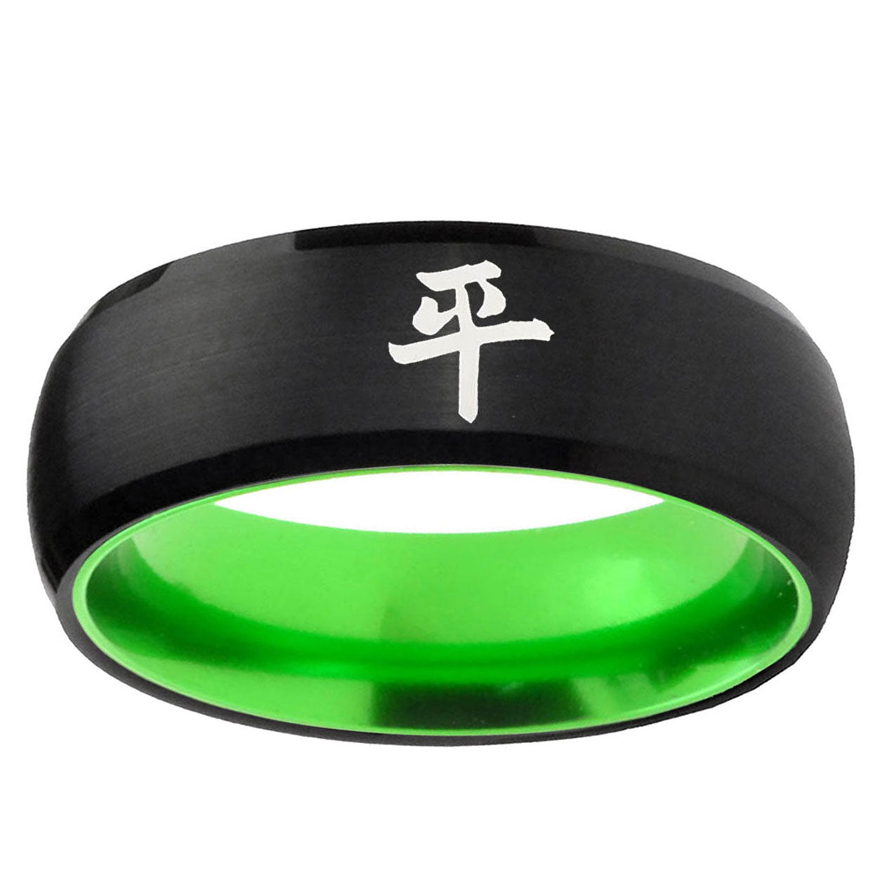 Intruding 8mm Kanji Peace Dome Black And Green Tungsten Carbide Custom Ring for Men . Offer in men wedding band in 8mm band width Black And Green plated finished from size 7 to 14