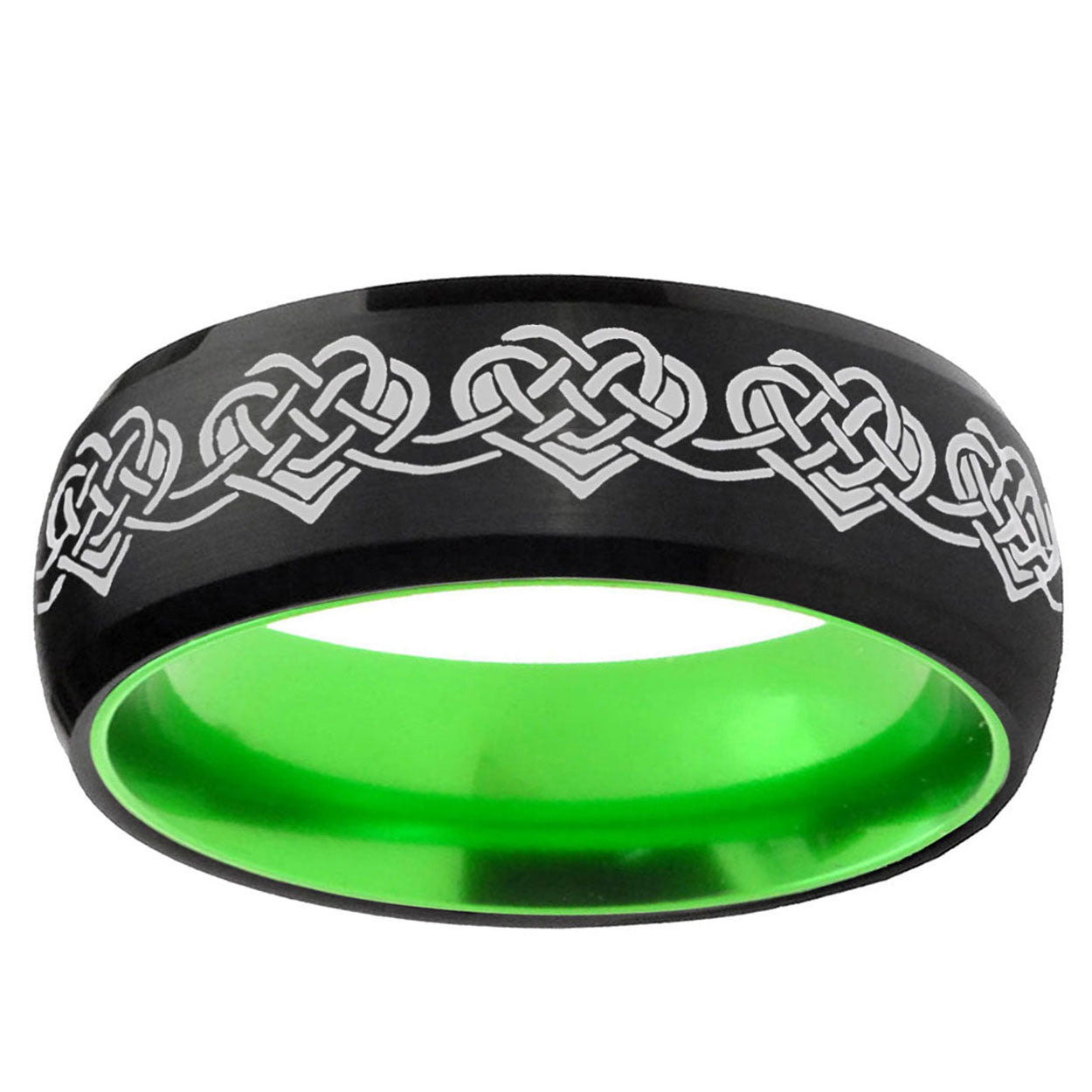 Intruding 8mm Celtic Knot Heart Dome Black And Green Tungsten Carbide Men's Wedding Ring . Offer in men wedding band in 8mm band width Black And Green plated finished from size 7 to 14