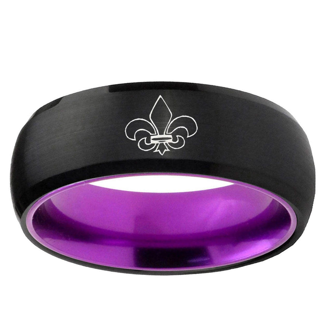 8mm Fleur-De-Lis Dome Black And Purple Tungsten Carbide Engraved Ring