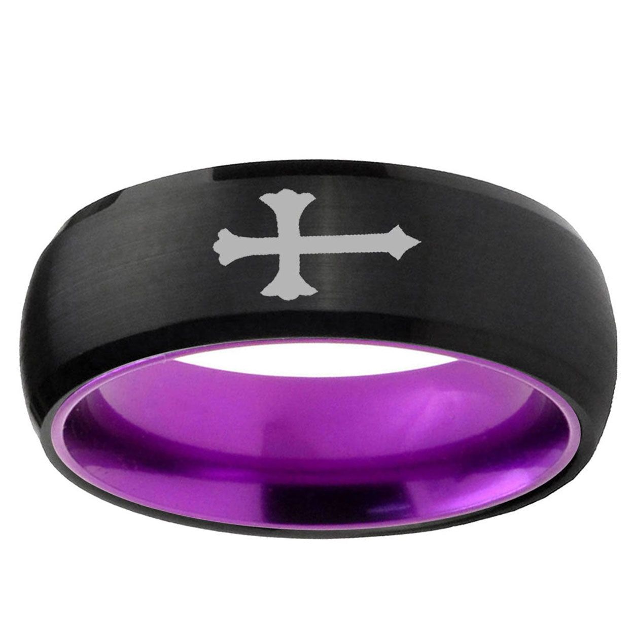 Intruding 8mm Christian Cross Dome Black And Purple Tungsten Mens Engagement Band . Offer in men wedding band in 8mm band width Black And Purple plated finished from size 7 to 14