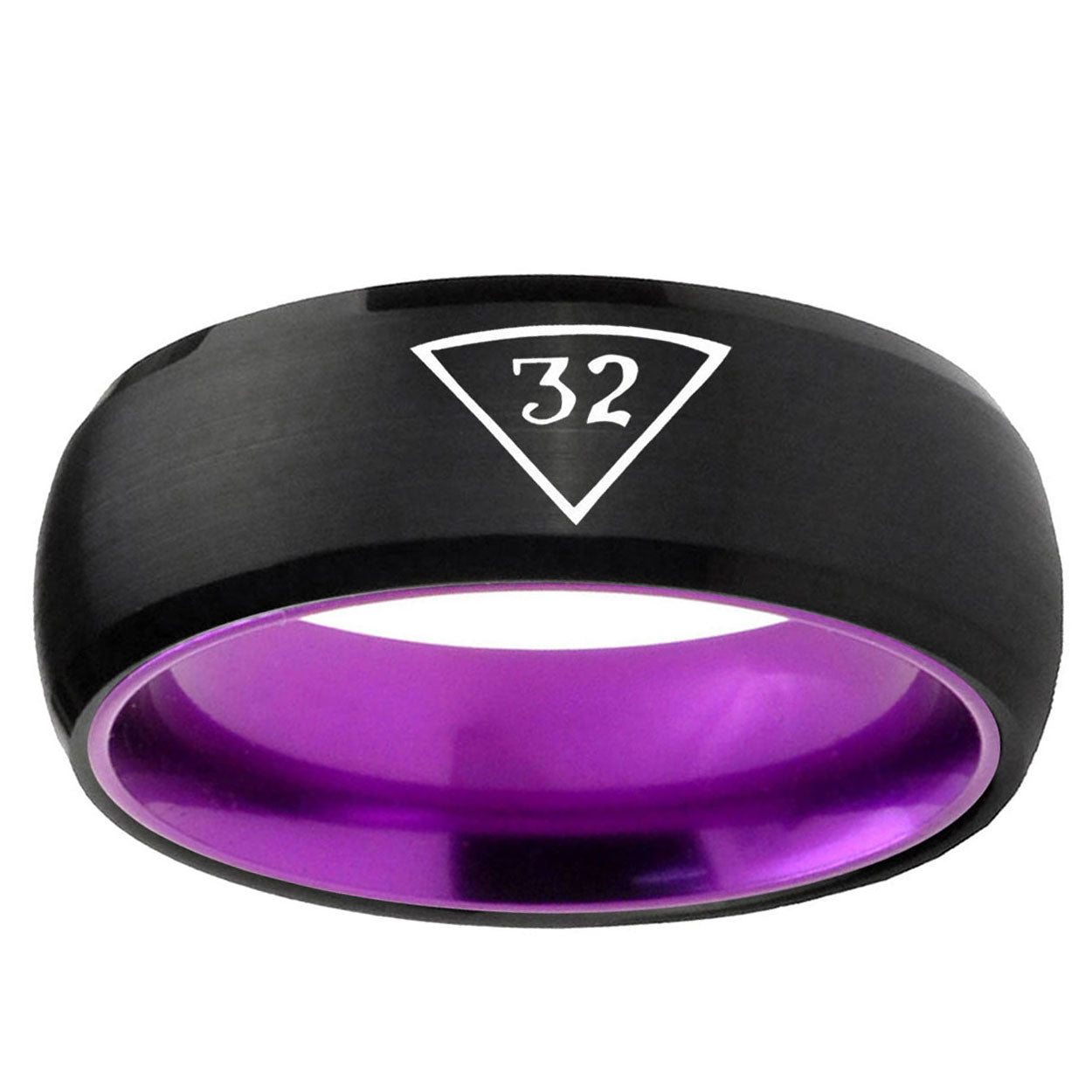 Intruding 8mm Masonic 32 Triangle Freemason Dome Black And Purple Tungsten Carbide Custom Mens Ring . Offer in men wedding band in 8mm band width Black And Purple plated finished from size 7 to 14