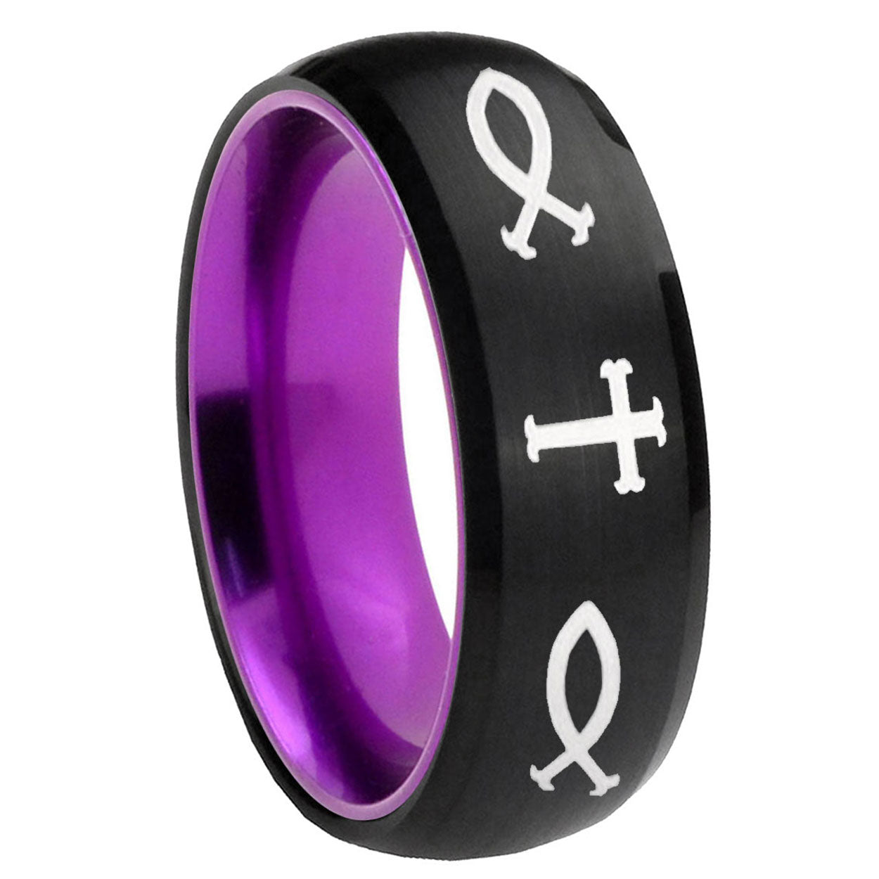 8mm Fish & Cross Dome Black And Purple Tungsten Carbide Wedding Band Men's