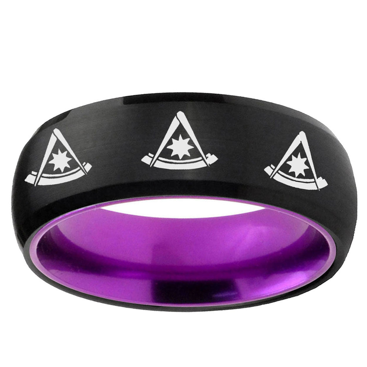 Intruding 8mm Multiple Pester Master Masonic Dome Black And Purple Tungsten Men's Ring . Offer in men wedding band in 8mm band width Black And Purple plated finished from size 7 to 14