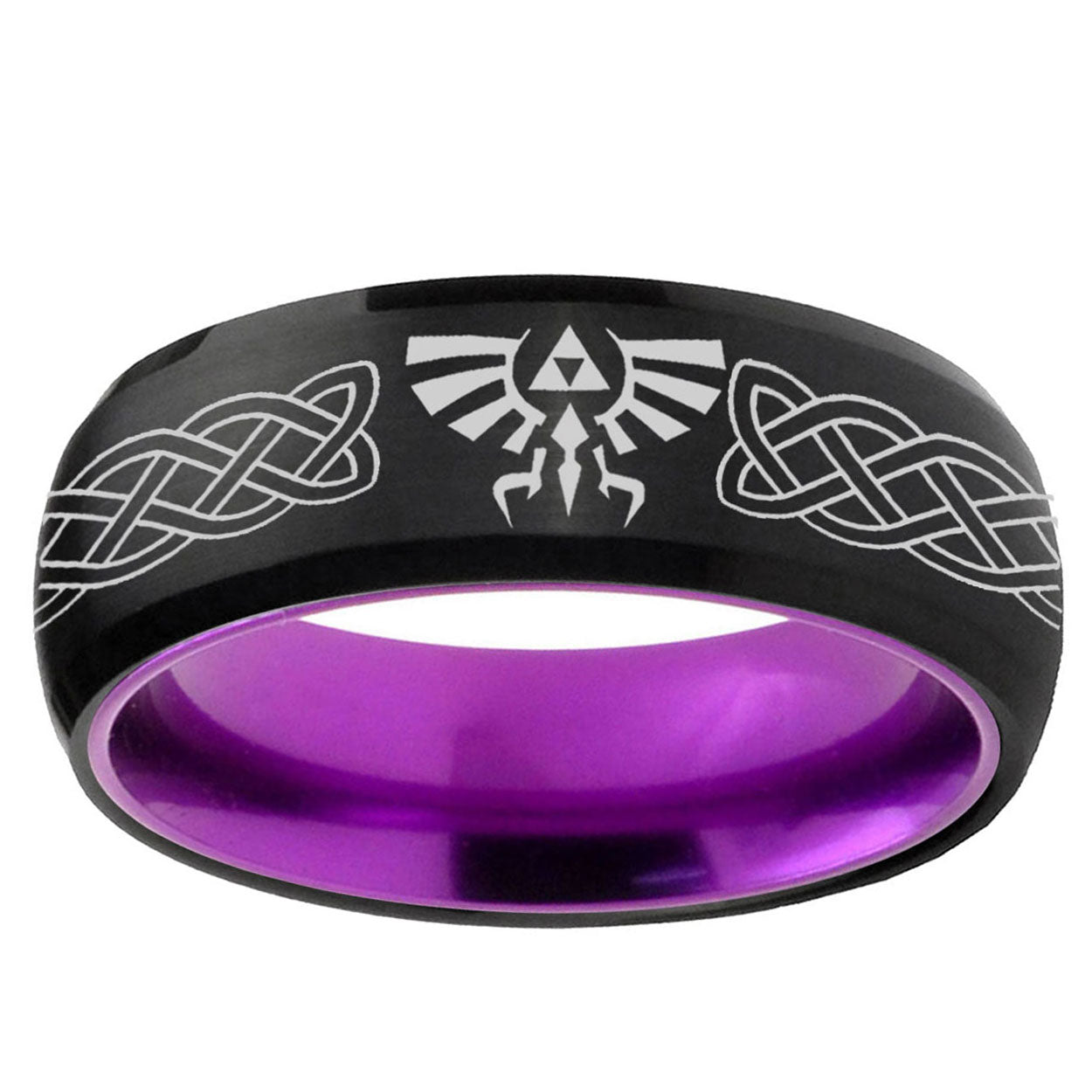 Intruding 8mm Celtic Zelda Dome Black And Purple Tungsten Carbide Mens Engagement Band . Offer in men wedding band in 8mm band width Black And Purple plated finished from size 7 to 14