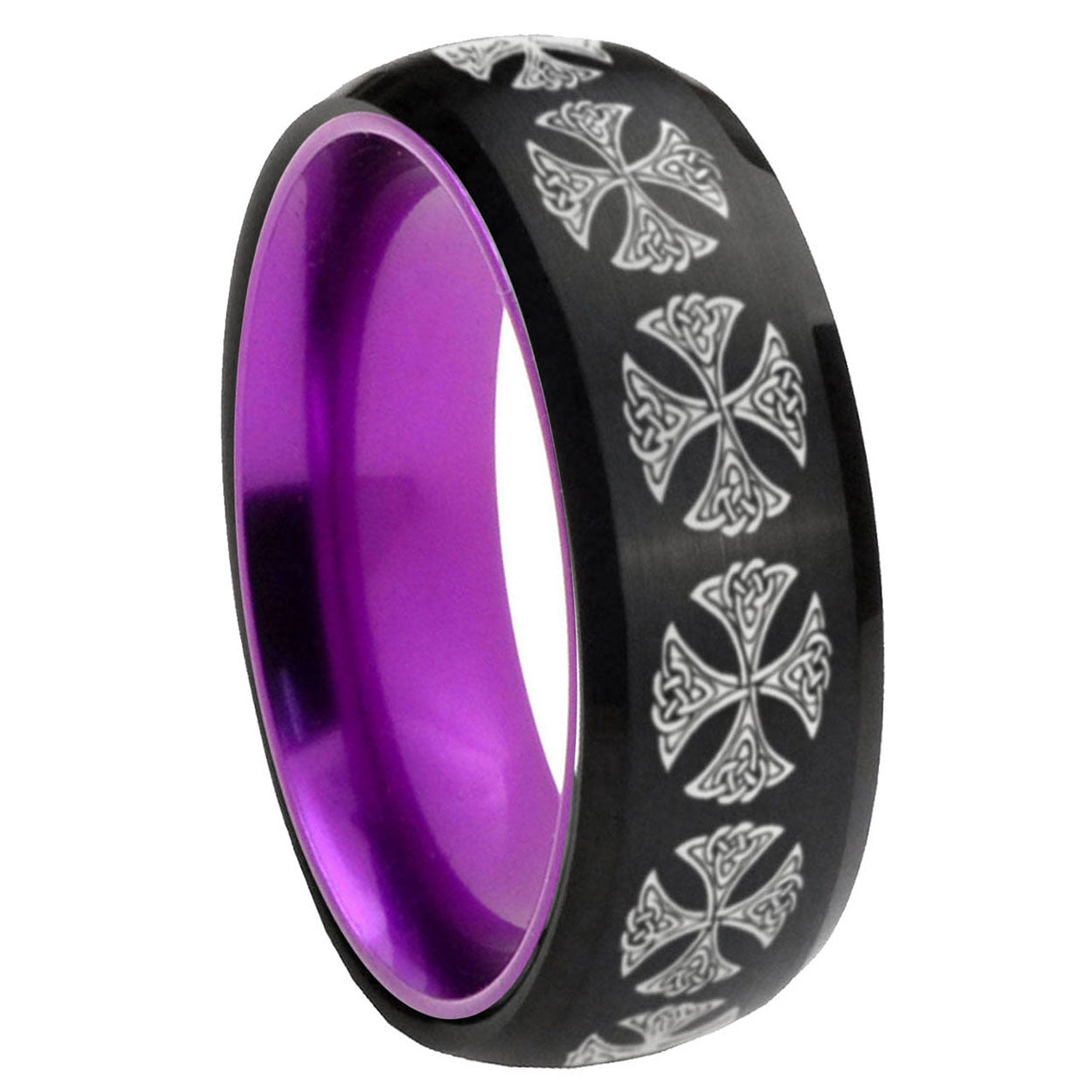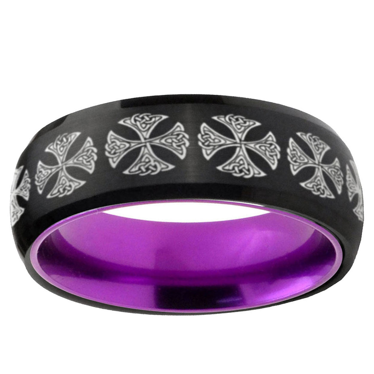Intruding 8mm Medieval Cross Dome Black And Purple Tungsten Carbide Men's Wedding Ring . Offer in men wedding band in 8mm band width Black And Purple plated finished from size 7 to 14
