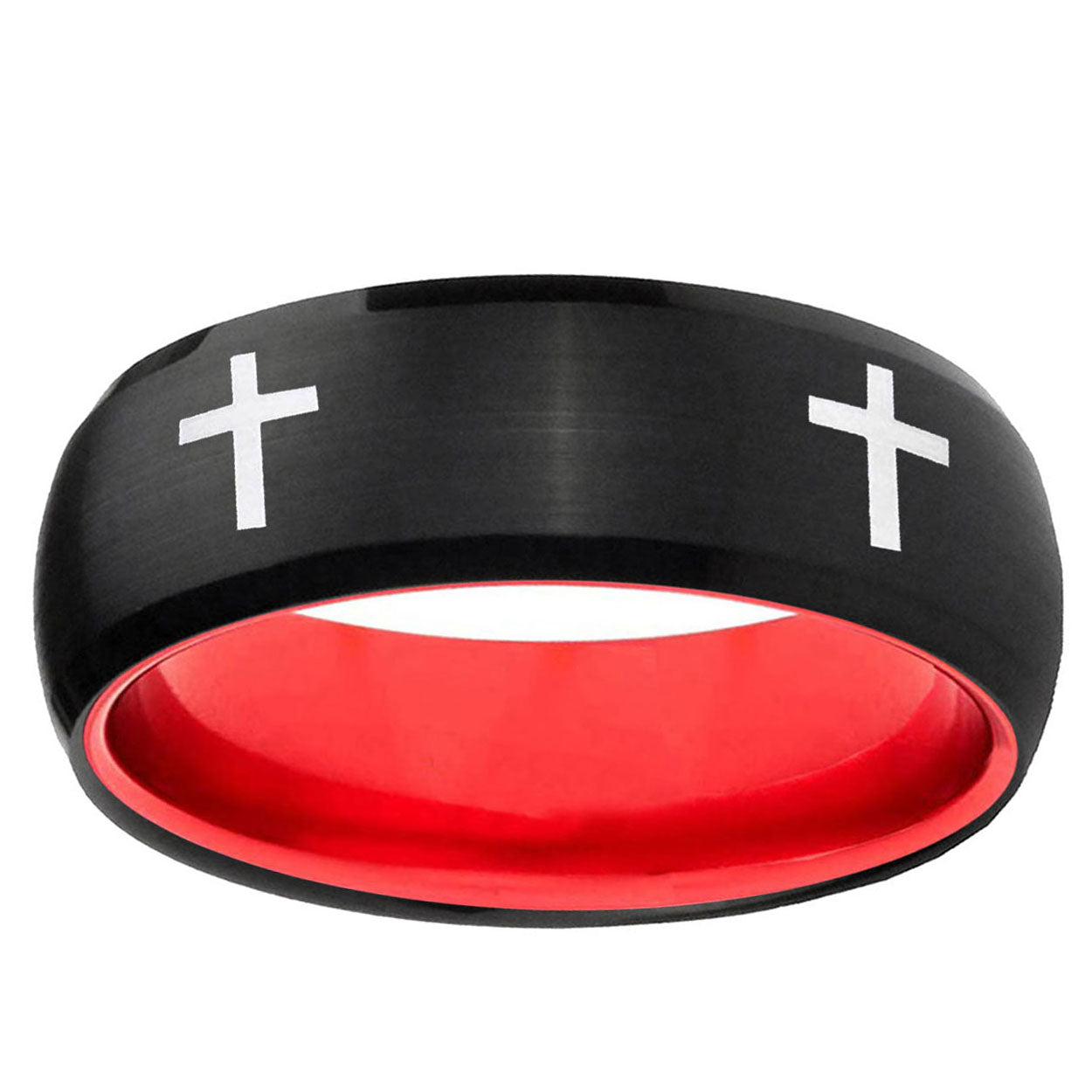 8mm Crosses Dome Black And Red Tungsten Carbide Custom Men's Ring