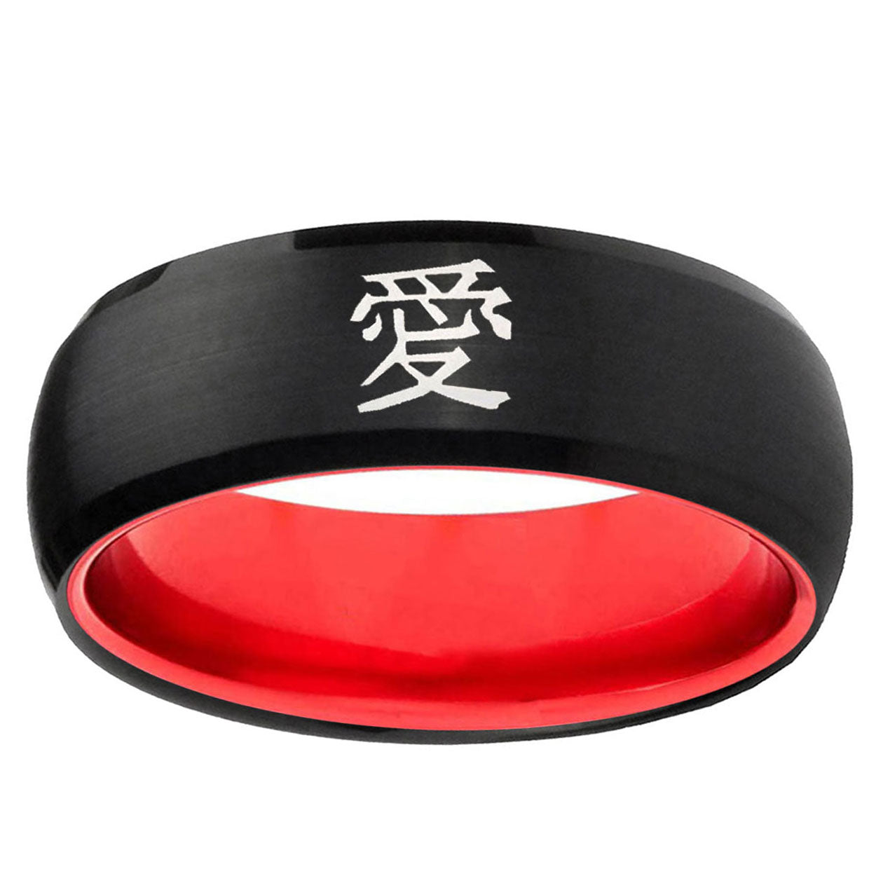 Intruding 8mm Kanji Love Dome Black And Red Tungsten Carbide Mens Engagement Ring . Offer in men wedding band in 8mm band width Black And Red plated finished from size 7 to 14