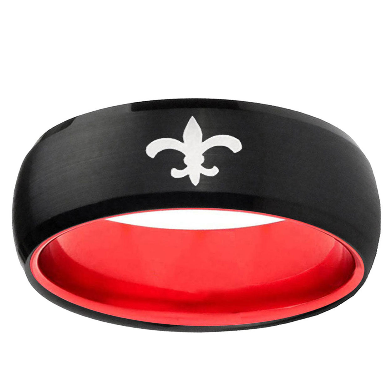 Intruding 8mm Fleur-De-Lis Dome Black And Red Tungsten Carbide Mens Ring Engraved . Offer in men wedding band in 8mm band width Black And Red plated finished from size 7 to 14
