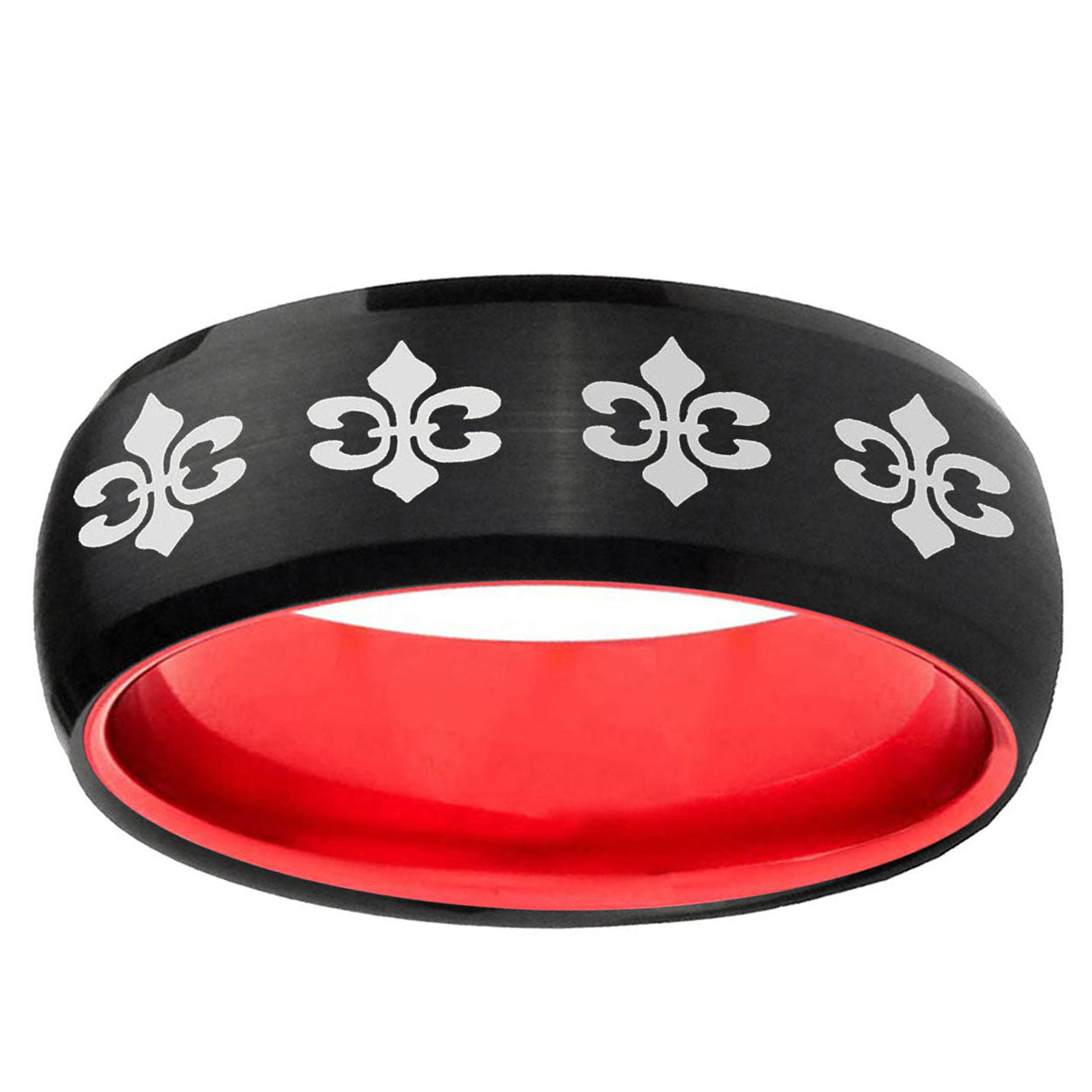 Intruding 8mm Multiple Fleur-De-Lis Dome Black And Red Tungsten Men's Band Ring . Offer in men wedding band in 8mm band width Black And Red plated finished from size 7 to 14