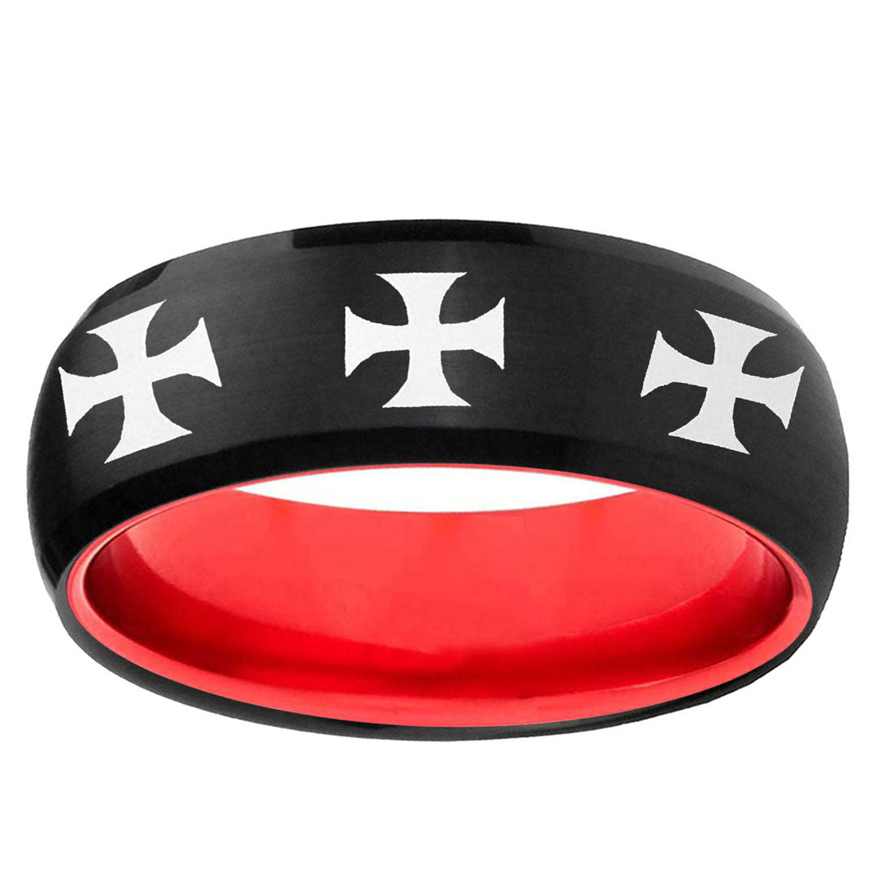 Intruding 8mm Multiple Maltese Cross Dome Black And Red Tungsten Mens Wedding Ring . Offer in men wedding band in 8mm band width Black And Red plated finished from size 7 to 14