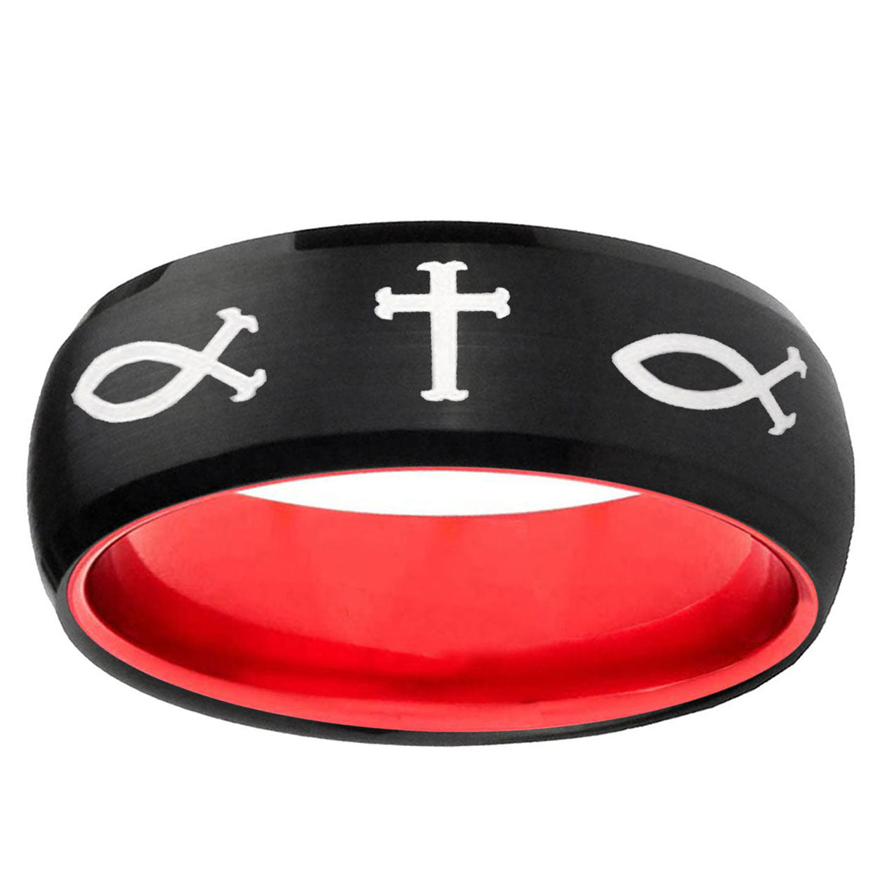 Intruding 8mm Fish & Cross Dome Black And Red Tungsten Carbide Wedding Band Mens . Offer in men wedding band in 8mm band width Black And Red plated finished from size 7 to 14