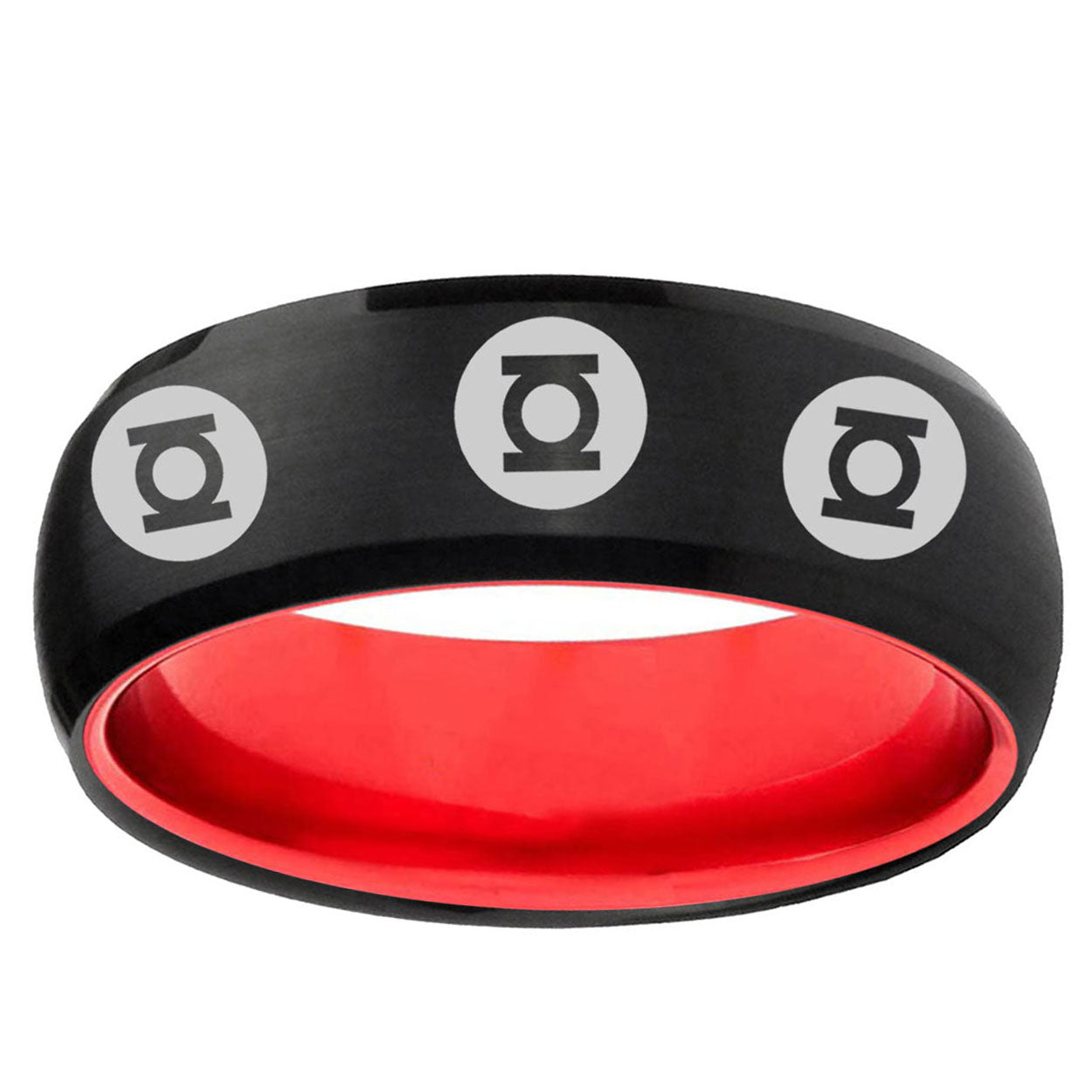 Intruding 8mm Multiple Green Lantern Dome Black And Red Unique Men Wedding Ring . Offer in men wedding band in 8mm band width brushed Black And Red plated finished from size 7 to 14