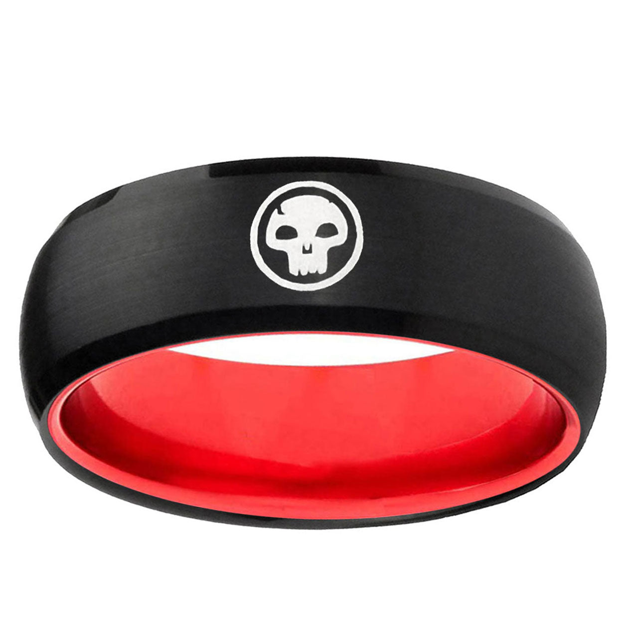 Intruding 8mm Skull Dome Black And Red Tungsten Carbide Wedding Engraving Ring . Offer in men wedding band in 8mm band width Black And Red plated finished from size 7 to 14