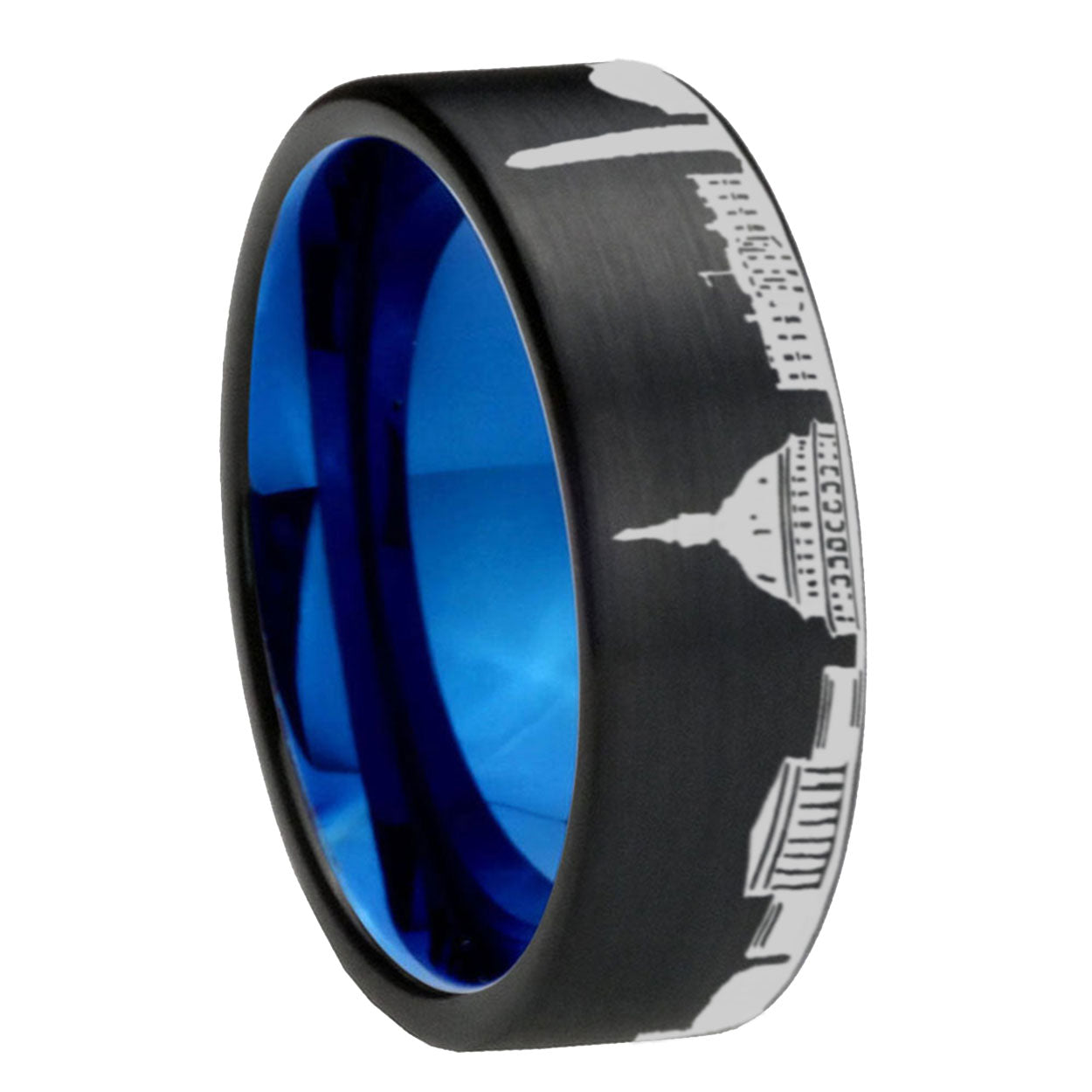 8mm DC Washington City Pipe Cut Brushed Black Tungsten Blue Plated Inside Engraved Ring