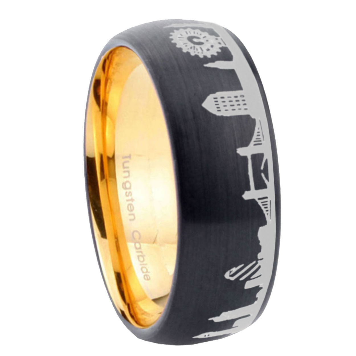 8mm UK London City Dome Brushed Black Tungsten Gold Plated Inside Engraved Ring