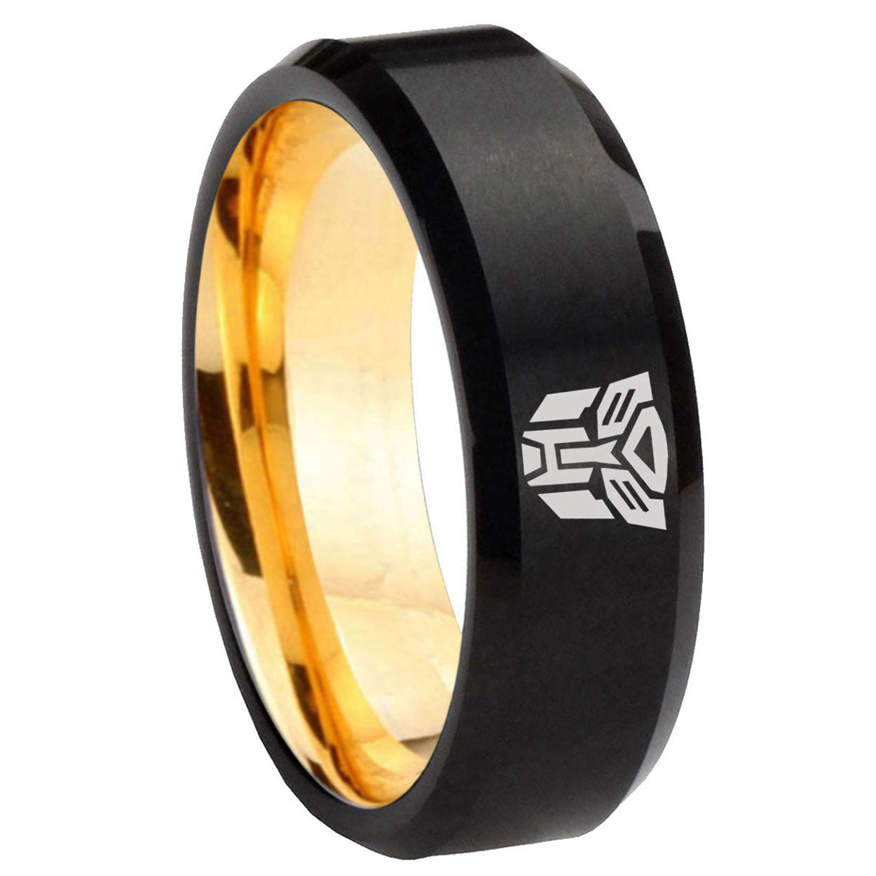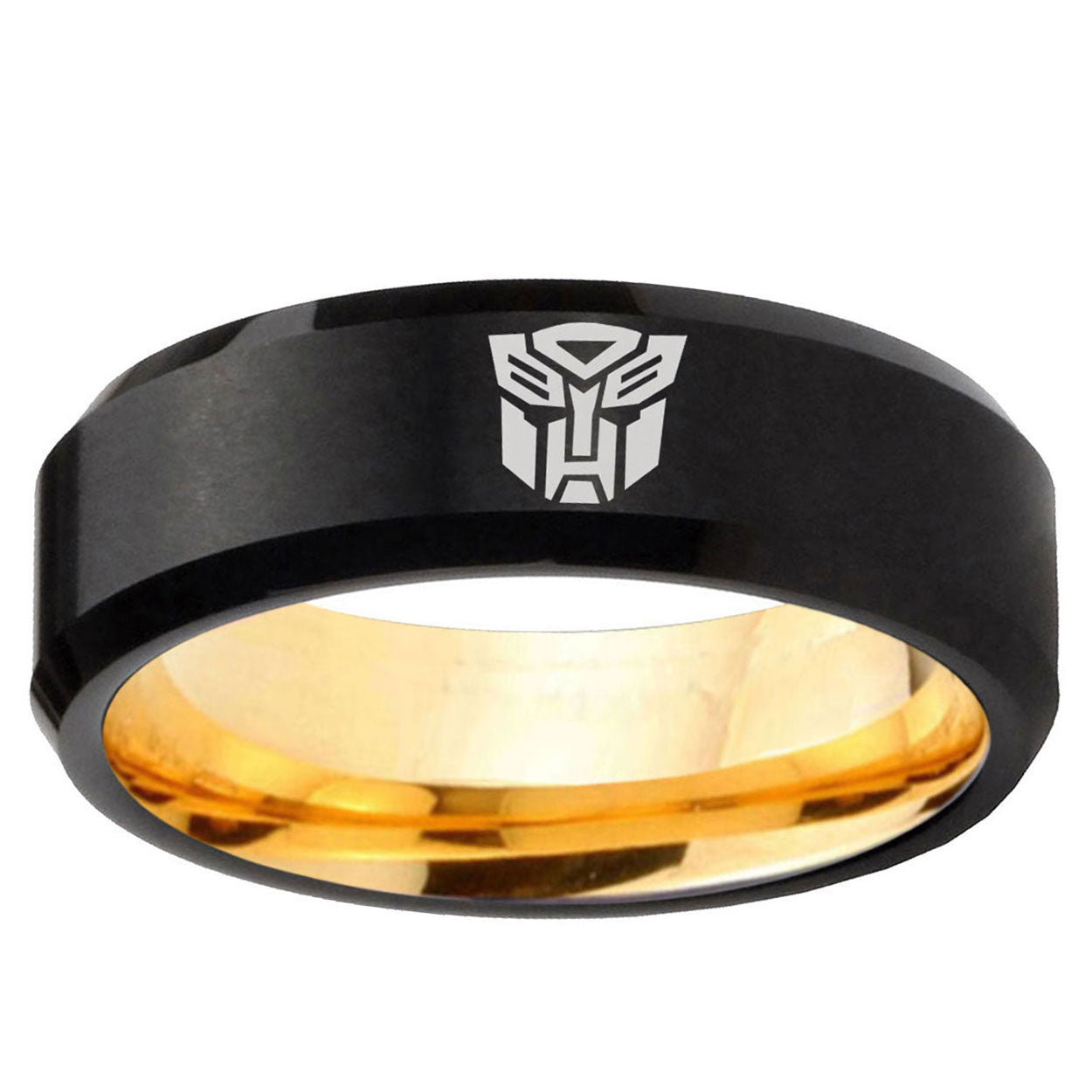 Intruding 8mm Transformers Autobot Beveled Edge Gold Black Metals For Men's Rings . Offer in 8mm band width black and gold plated finished from size 7 to 14
