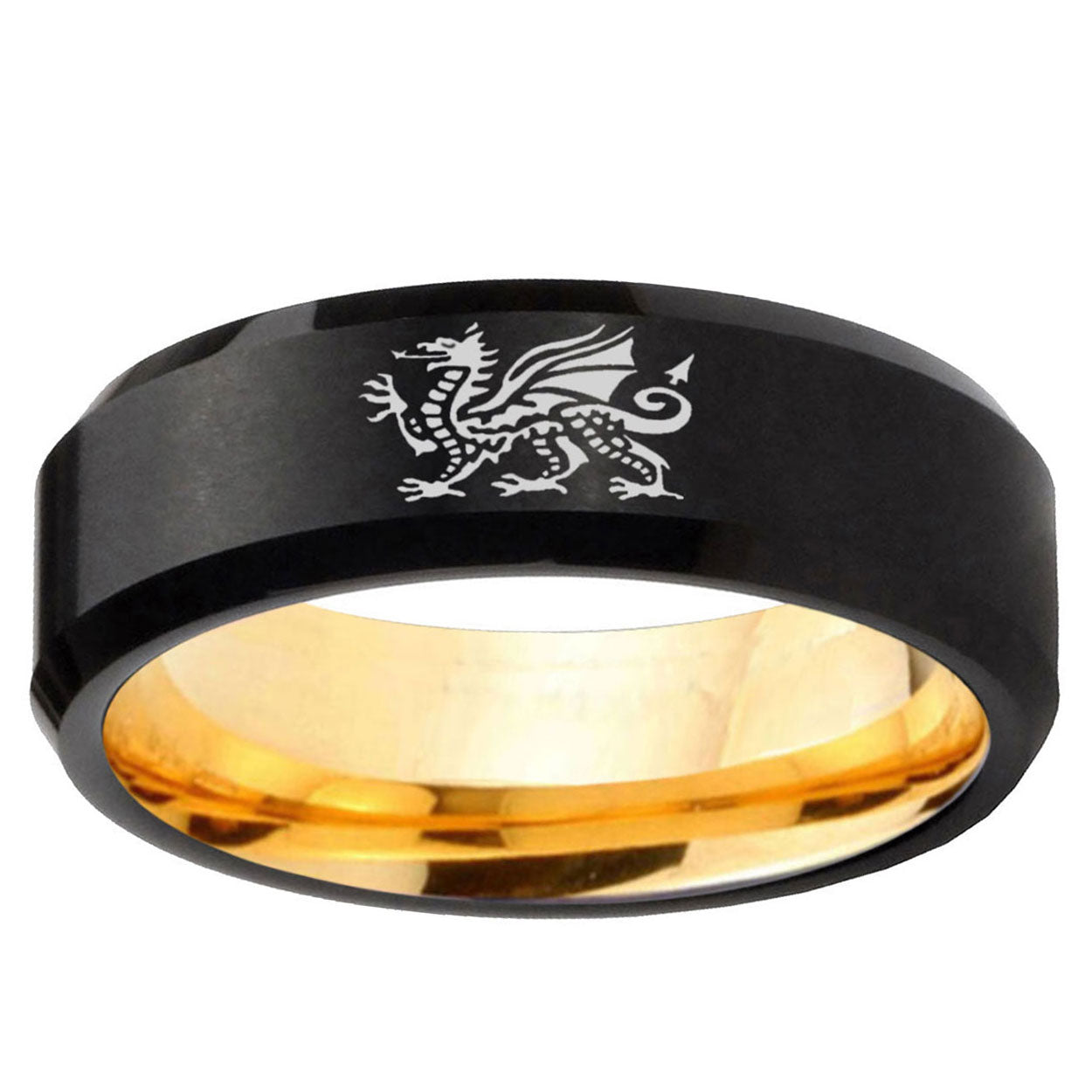 Intruding 8mm Dragon Beveled Edge Black And Gold Tungsten Carbide Rings for Men . Offer in men wedding band in 8mm band width black and gold plated finished from size 7 to 14