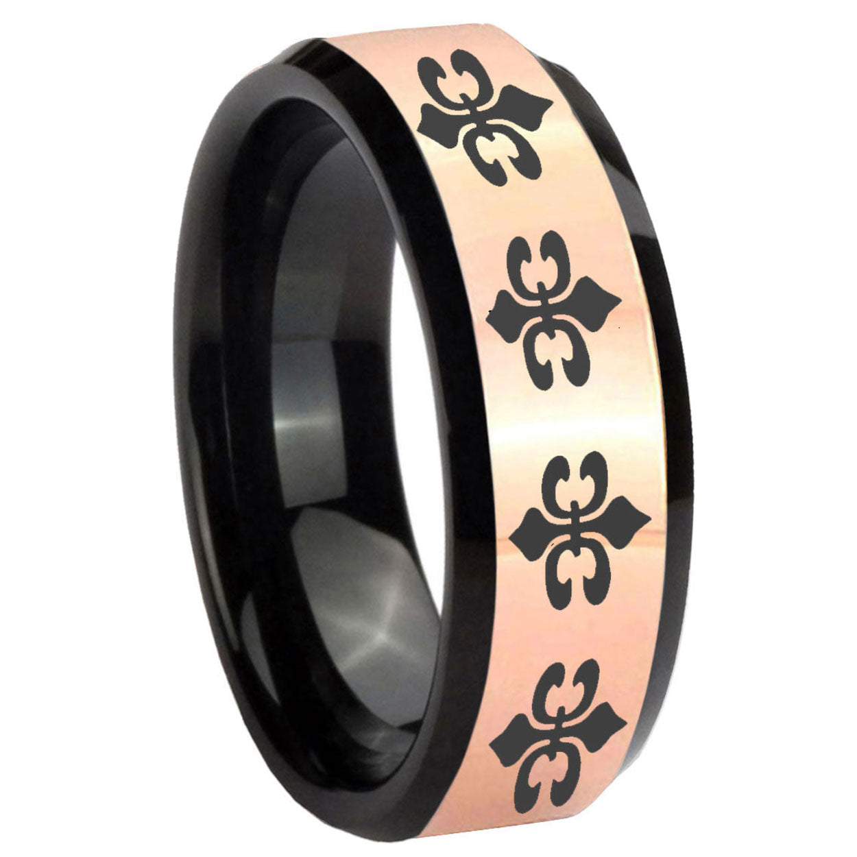 8mm Multiple Fleur-De-Lis Rose Gold And Black Beveled Edge Tungsten Men's Band Ring