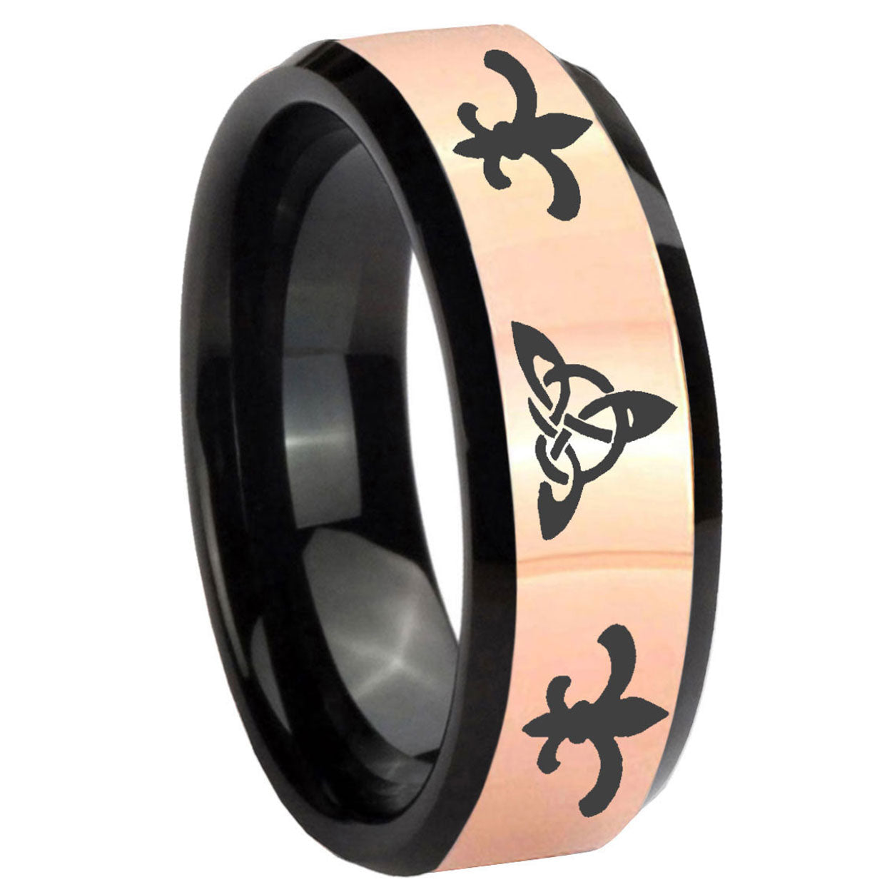8mm Celtic Triangle Fleur-De-Lis Rose Gold And Black Beveled Edge Tungsten Promise Ring