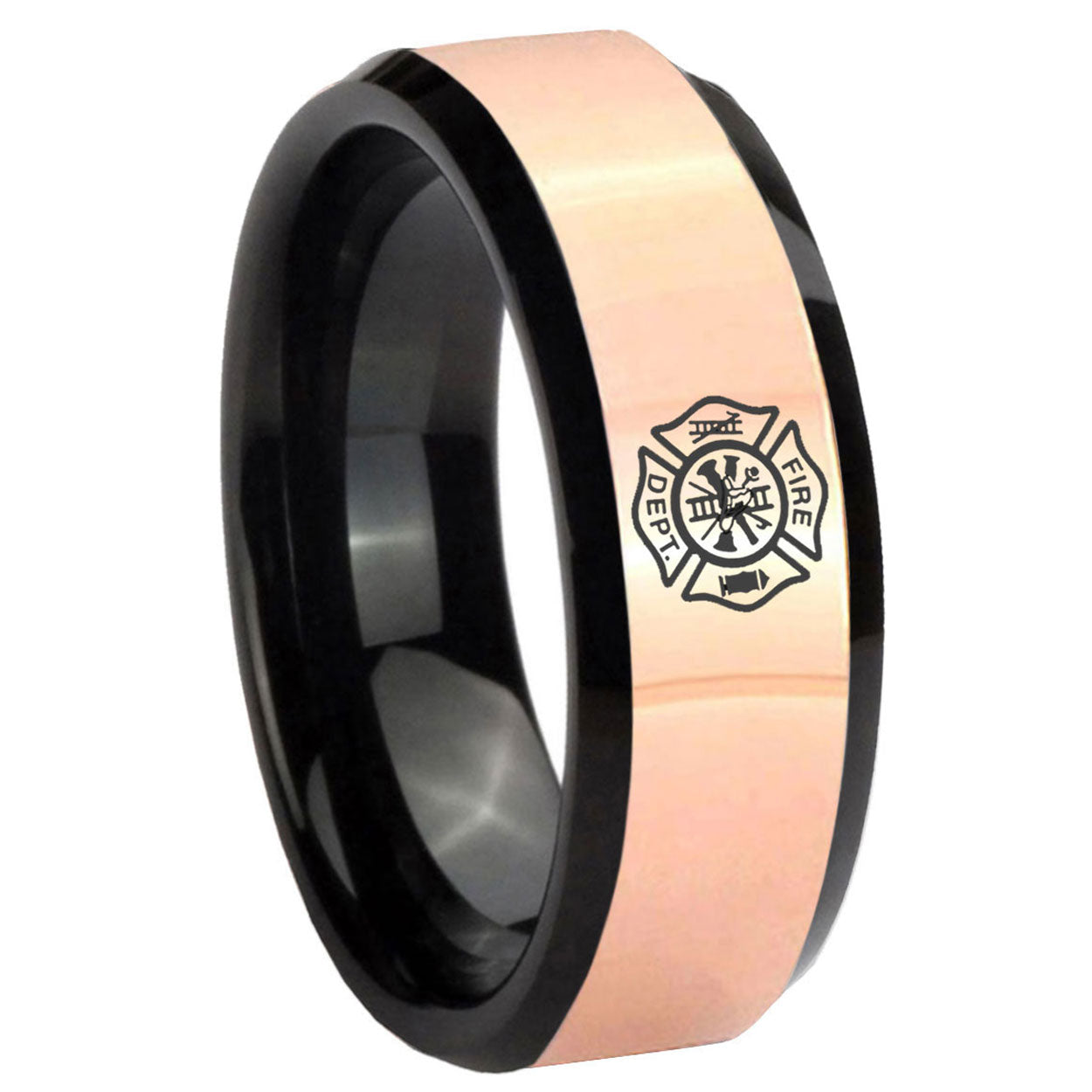 8mm Fire Department Rose Gold And Black Beveled Edge Tungsten Carbide Rings for Men