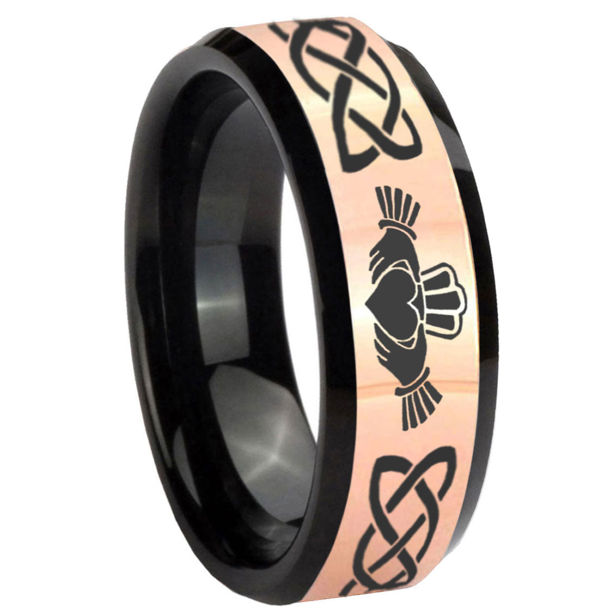 8mm Irish Claddagh Rose Gold And Black Beveled Edge Tungsten Wedding Band