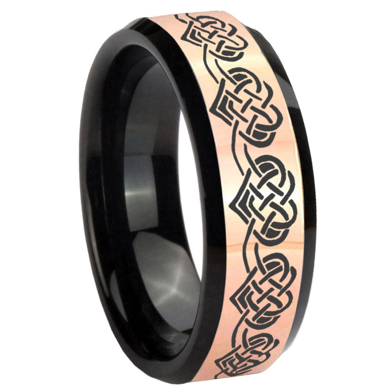 Intruding 8mm Celtic Knot Heart Rose Gold And Black Beveled Edge Tungsten Carbide Men's Wedding Ring . Offer in men wedding band in 8mm band width rose gold black plated finished from size 7 to 14