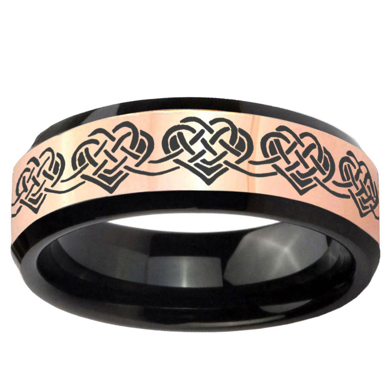8mm Celtic Knot Heart Rose Gold And Black Beveled Edge Tungsten Carbide Men's Wedding Ring