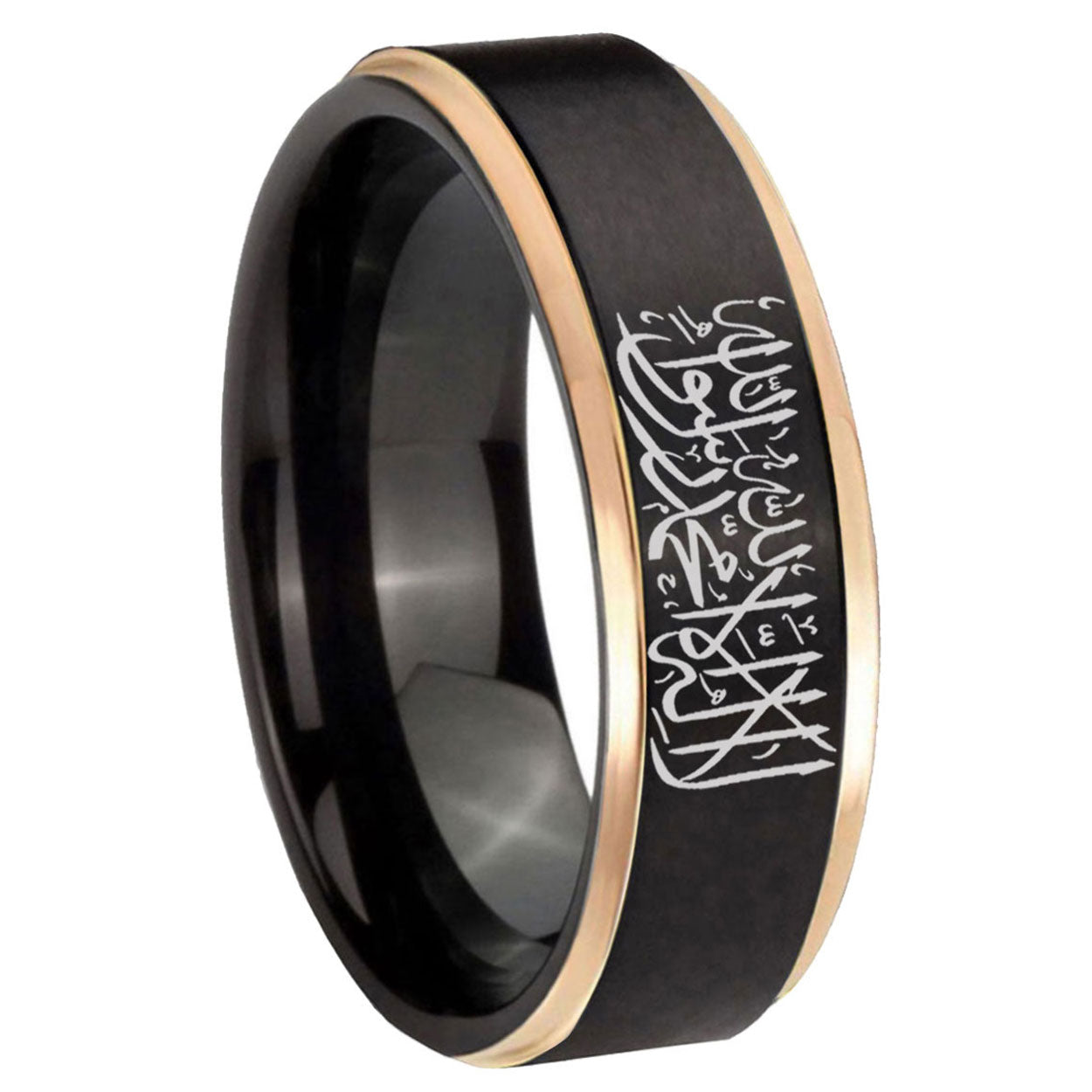Intruding 6, 8mm Islamic Shahada Rose Gold Step Edge Black Tungsten Carbide Mens Ring . Offer in both 6mm and 8mm band width brushed black plated finished from size 6 to 14