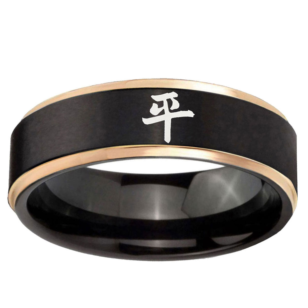 Intruding 6, 8mm Kanji Peace Rose Gold Step Edge Black Tungsten Carbide Custom Ring for Men . Offer in both 6mm and 8mm band width black plated finished from size 6 to 14