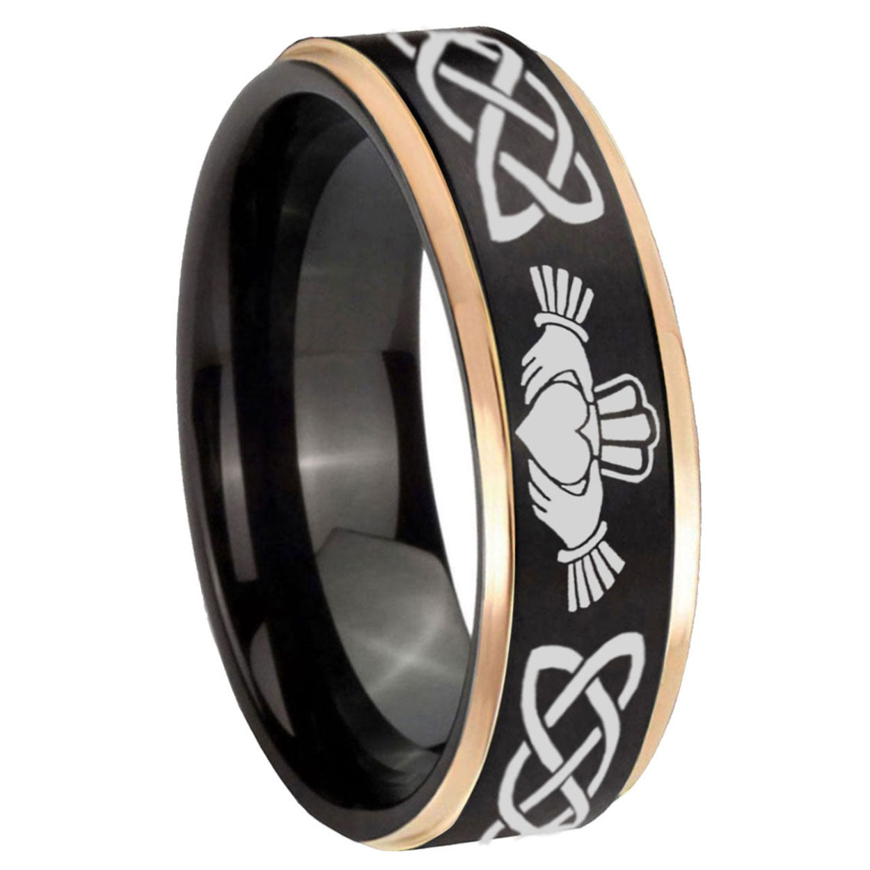 6, 8mm Irish Claddagh Rose Gold Step Edge Black Tungsten Wedding Band