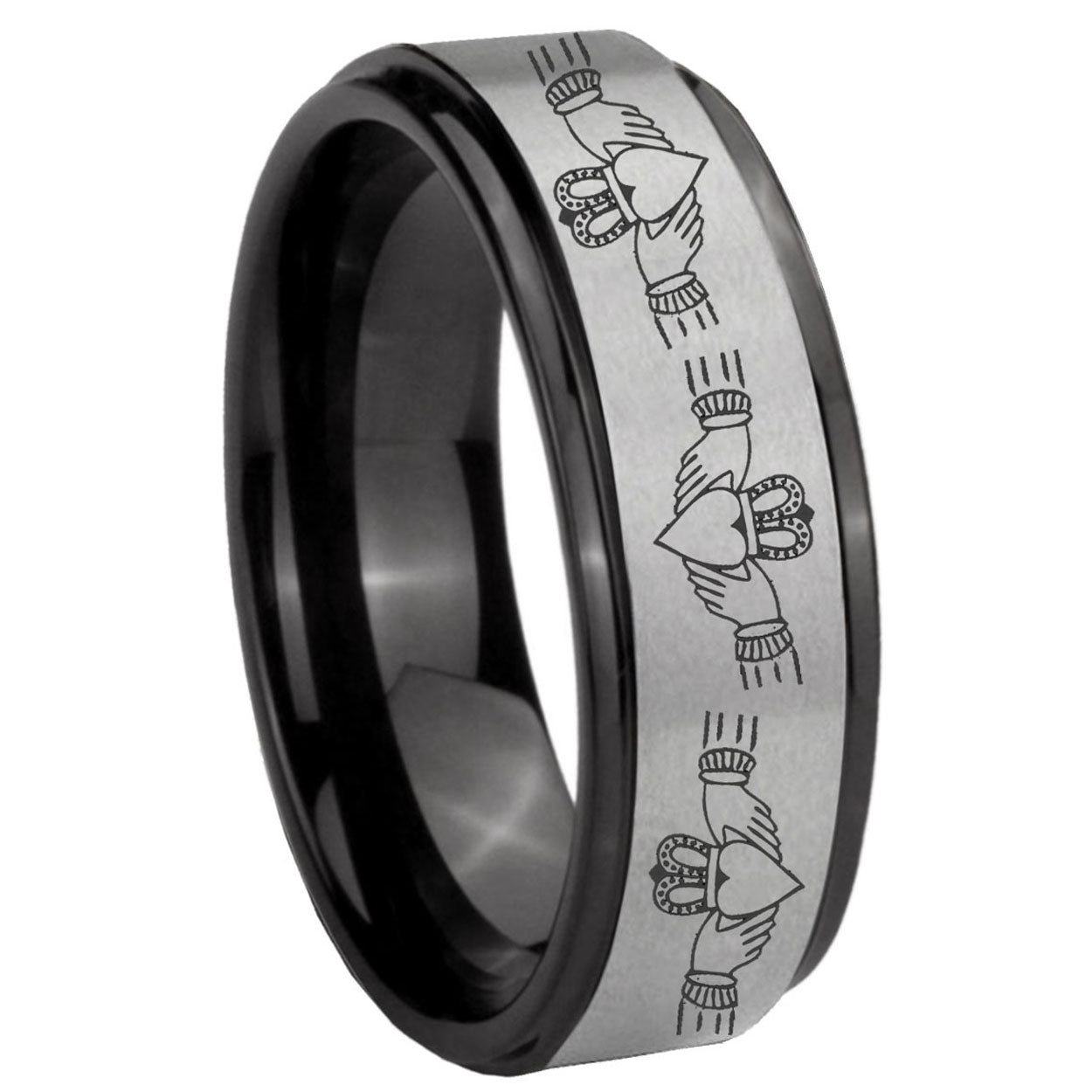 Intruding 6, 8mm Irish Claddagh Black Step Edge Gray Tungsten Carbide Engagement Ring . Offer in both 6mm and 8mm band width black plated finished from size 7 to 14