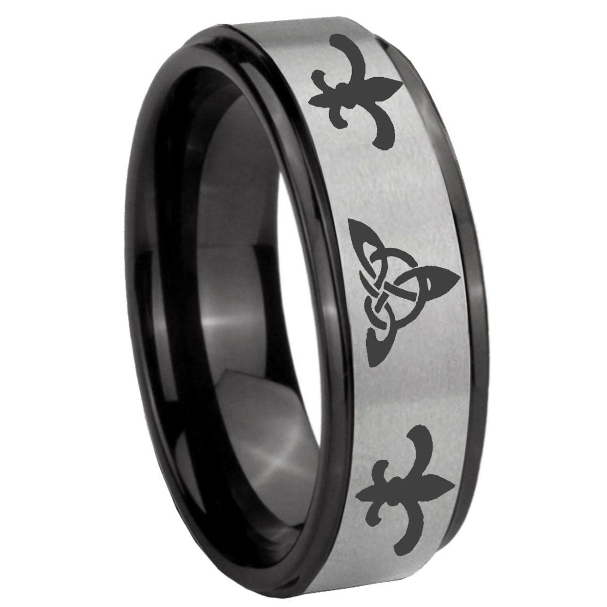 Intruding 6, 8mm Celtic Triangle Fleur-De-Lis Black Step Edge Gray Tungsten Promise Ring . Offer in both 6mm and 8mm band width black plated finished from size 7 to 14