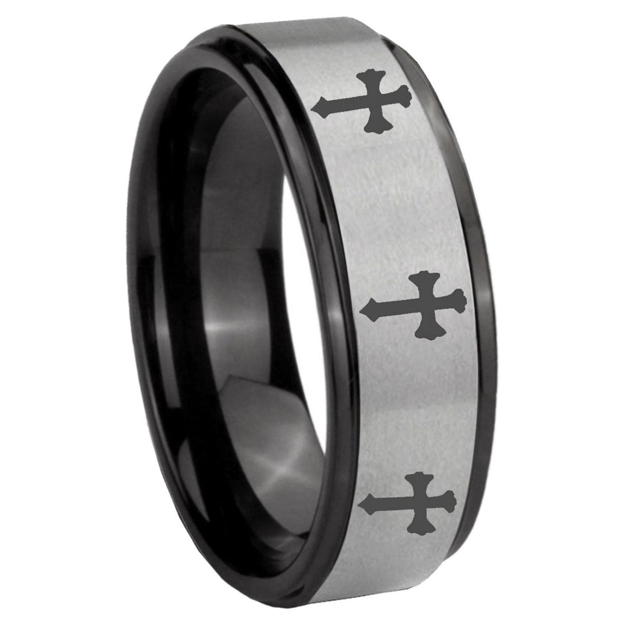 Intruding 6, 8mm Multiple Christian Cross Black Step Edge Gray Tungsten Wedding Bands Ring . Offer in both 6mm and 8mm band width black plated finished from size 7 to 14