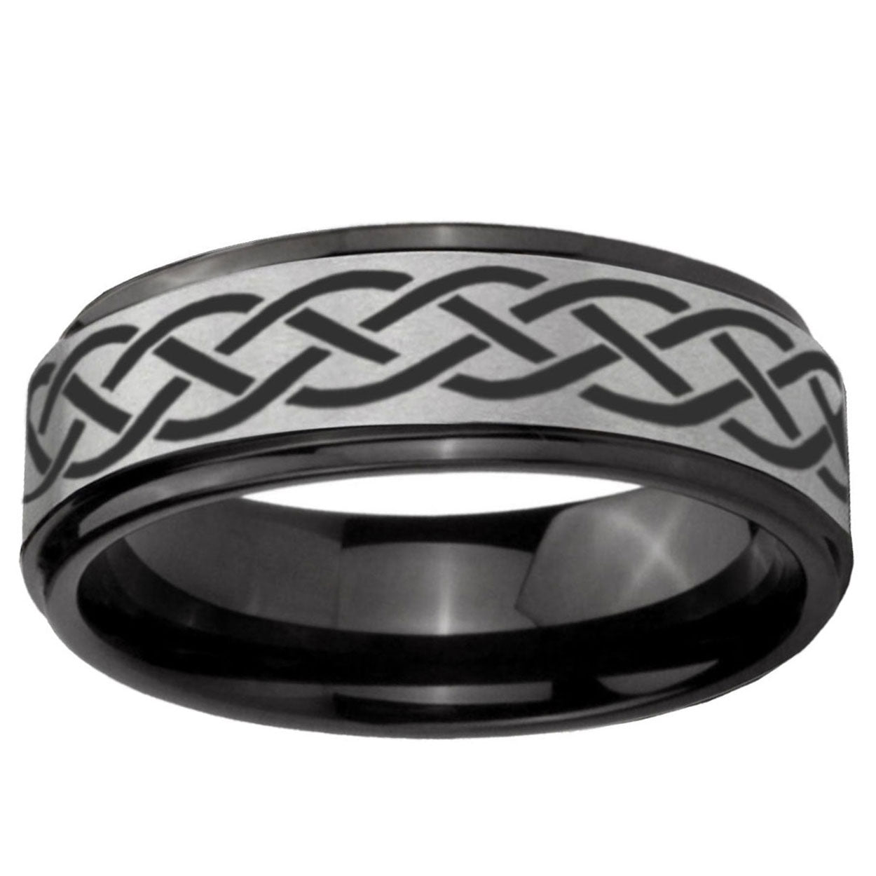 Intruding 6, 8mm Celtic Knot Black Step Edge Gray Tungsten Carbide Men's Wedding Ring . Offer in both 6mm and 8mm band width Black And Gray plated finished from size 7 to 14