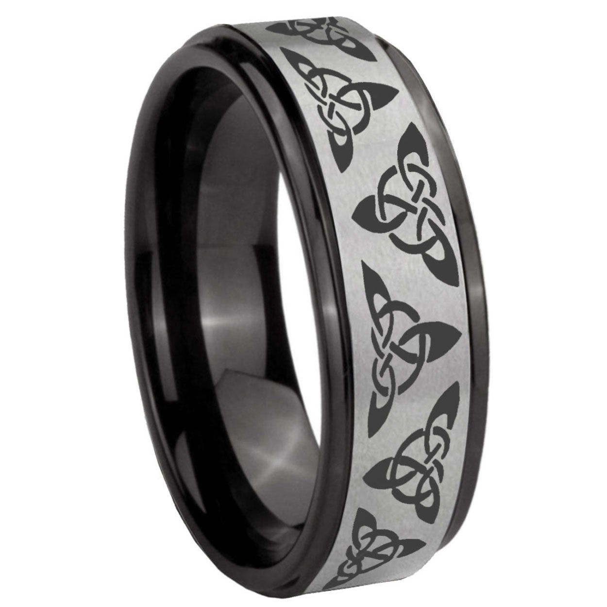 Intruding 6, 8mm Celtic Knot Black Step Edge Gray Tungsten Carbide Men's Wedding Ring . Offer in both 6mm and 8mm band width Black And Gray plated finished from size 7 to 14