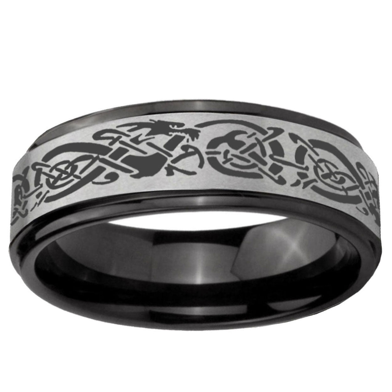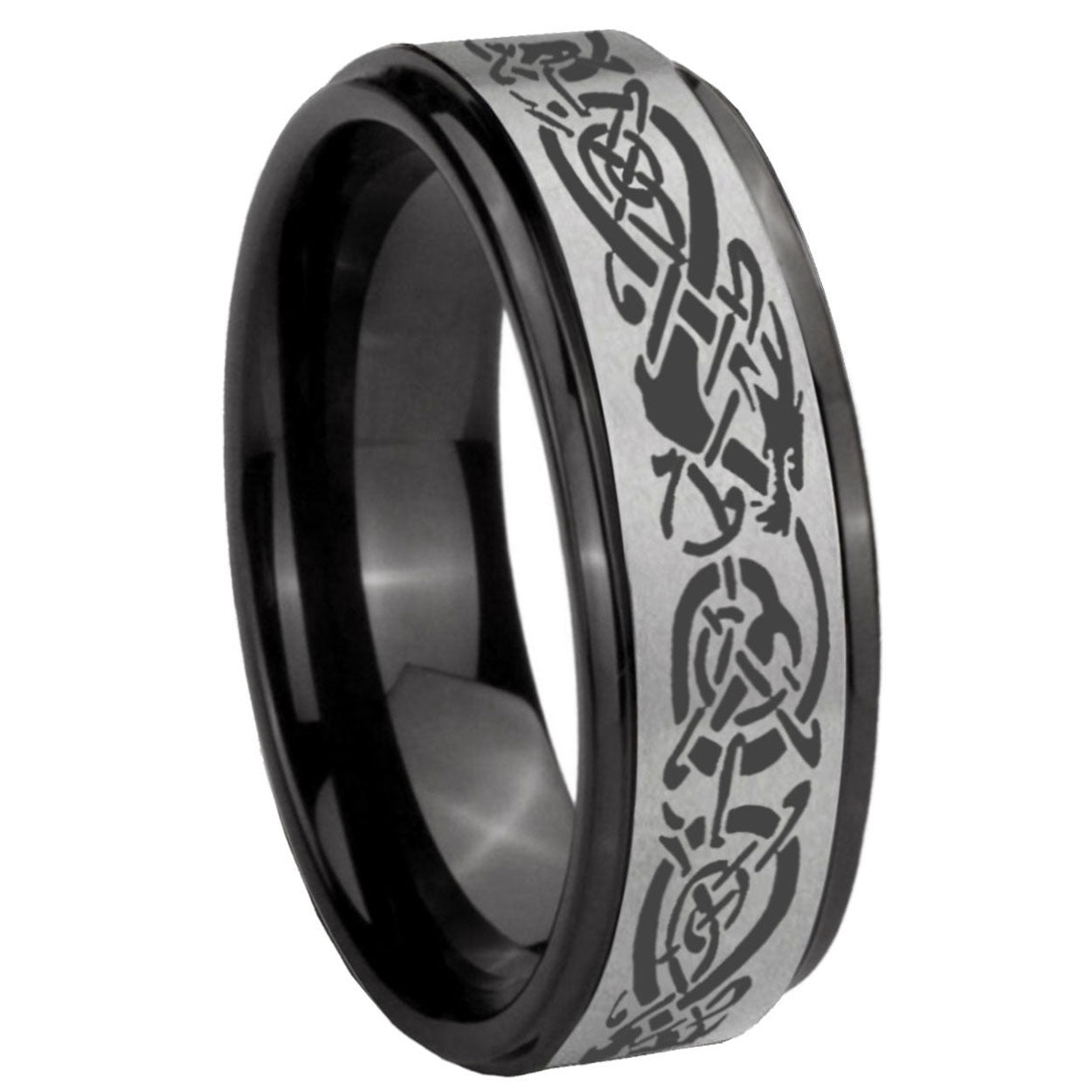 Intruding 6, 8mm Celtic Dragon Black Step Edge Gray Tungsten Carbide Men's Wedding Ring . Offer in both 6mm and 8mm band width Black And Gray plated finished from size 7 to 14