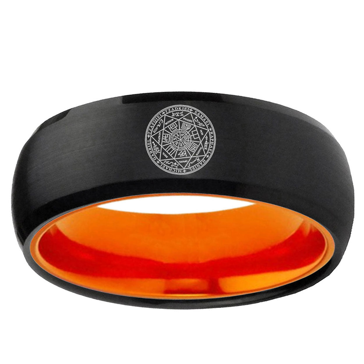 Intruding 8mm Seal of Seven Archangel Dome Black And Orange Tungsten Carbide Mens Ring . Offer in men wedding band in 8mm band width brushed Black And Orange plated finished from size 7 to 14