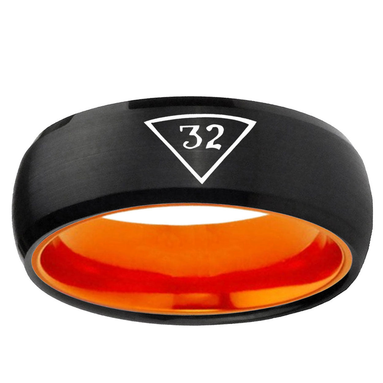 Intruding 8mm Masonic 32 Triangle Freemason Dome Black And Orange Tungsten Carbide Custom Mens Ring . Offer in men wedding band in 8mm band width Black And Orange plated finished from size 7 to 14
