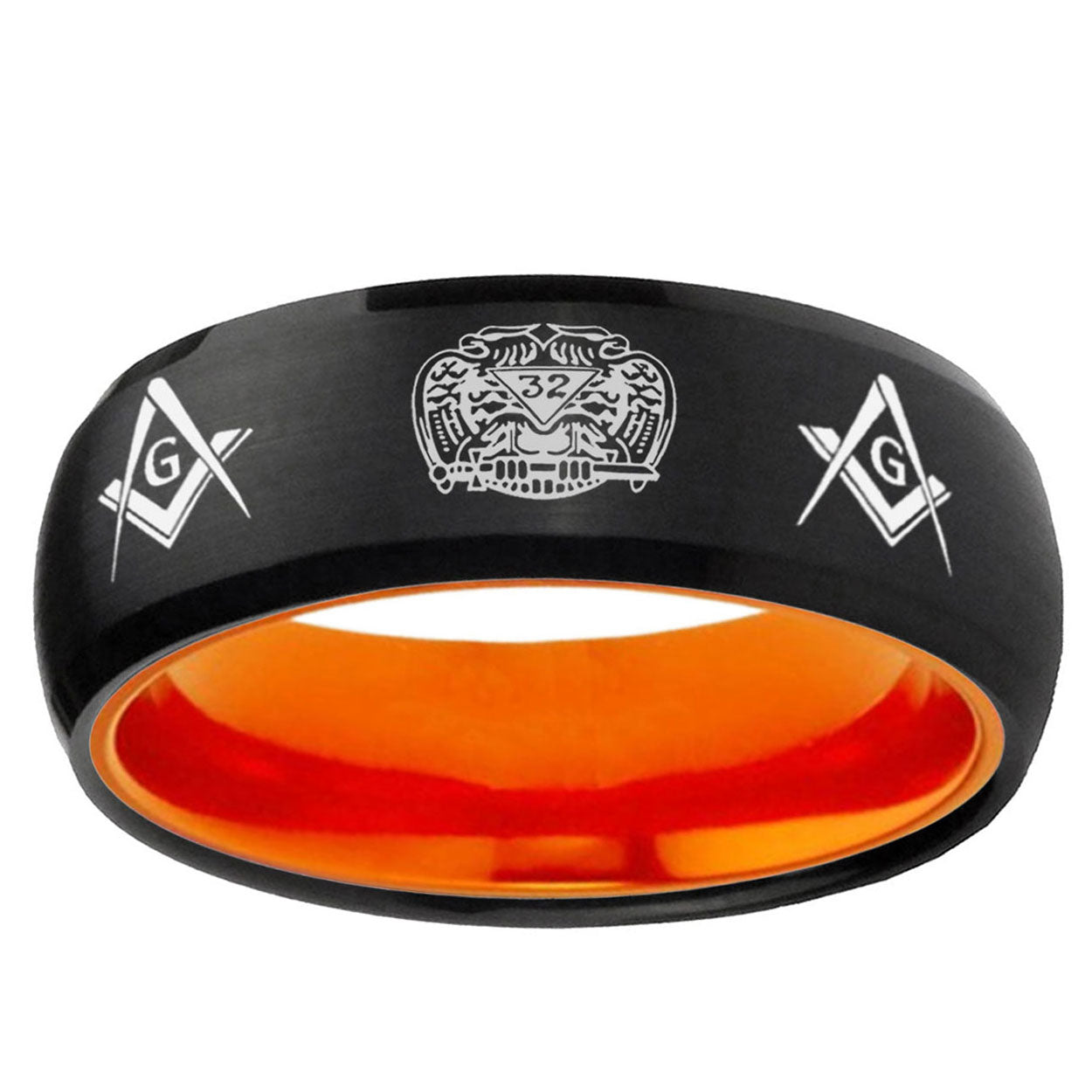 Intruding 8mm Masonic 32 Design Dome Black And Orange Tungsten Carbide Engagement Ring . Offer in men wedding band in 8mm band width Black And Orange plated finished from size 7 to 14