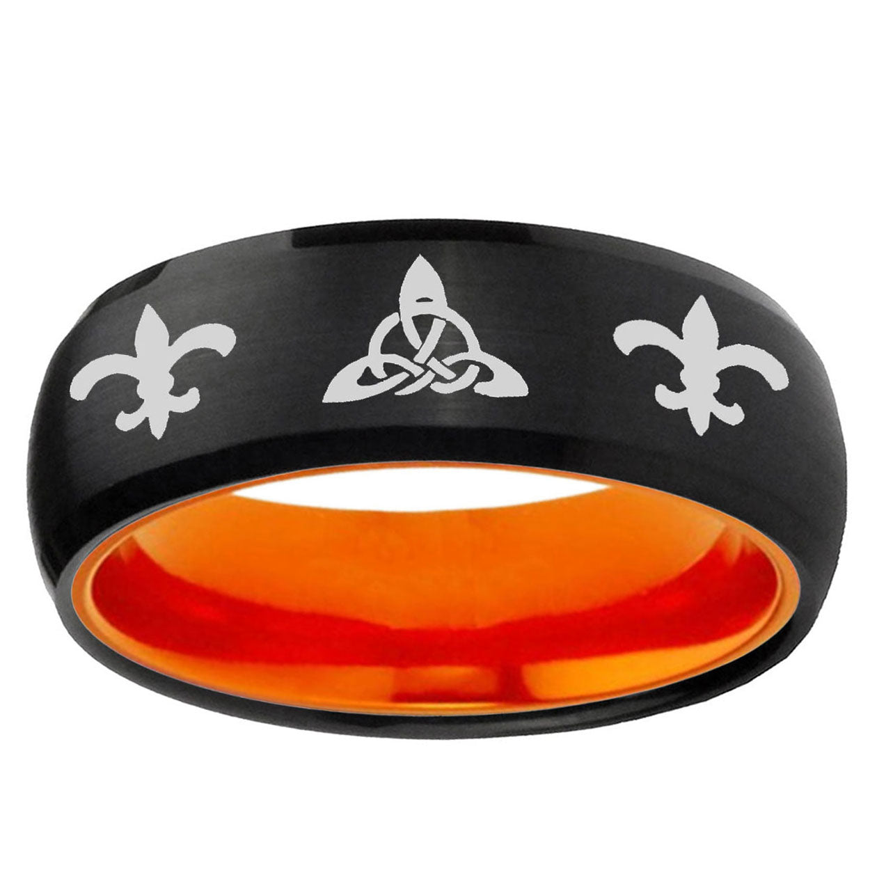 Intruding 8mm Celtic Triangle Fleur-De-Lis Dome Black And Orange Tungsten Promise Ring . Offer in men wedding band in 8mm band width Black And Orange plated finished from size 7 to 14