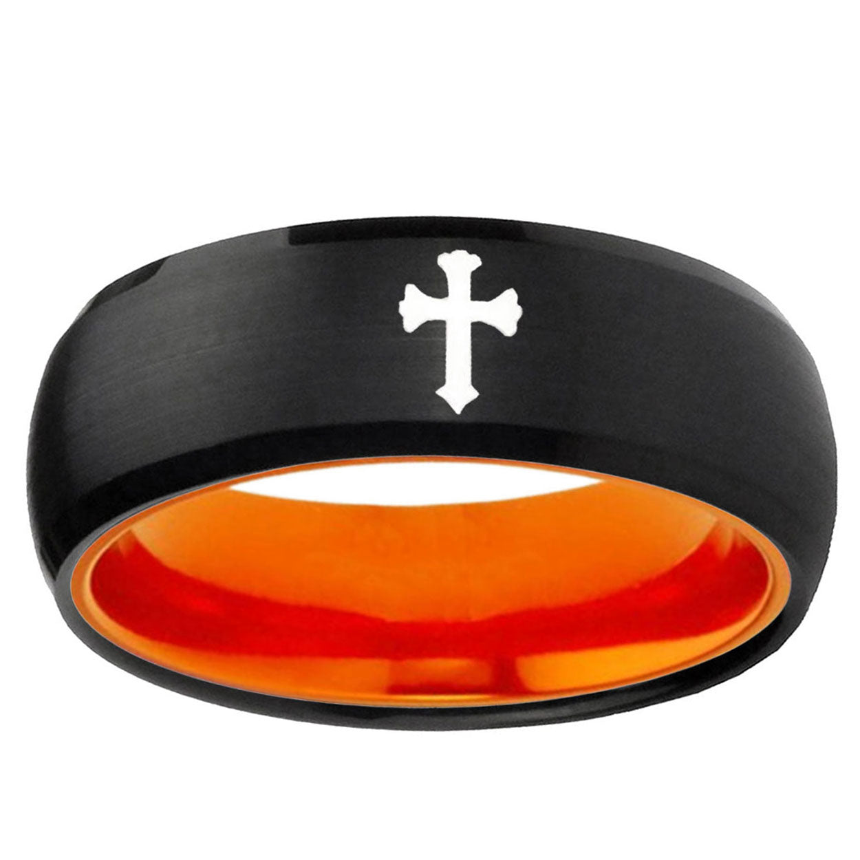 Intruding 8mm Flat Christian Cross Dome Black And Orange Tungsten Carbide Men's Wedding Ring . Offer in men wedding band in 8mm band width Black And Orange plated finished from size 7 to 14